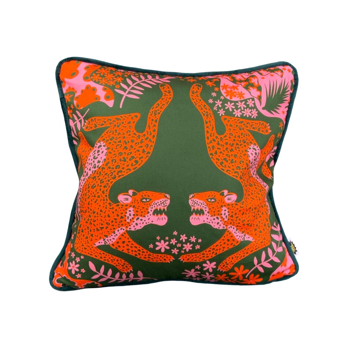 Elevate your home decor with our handmade Leopards cushion from The Neighbourhood Threat! Measuring 40 x 40cm, this luxurious cushion is not only beautiful but also practical with a zip fastening, which makes it easy to remove the cushion cover for cleaning or to change up your decor, while our hollow-fibre filled inners ensure long-lasting comfort and support. Handcrafted with care and attention to detail in our Manchester studio, this cushion features a handmade velvet piped trim for added sophistication and style. The soft velvet back also ensures comfort and coziness, making it perfect for lounging on the sofa or as a decorative accent on your bed.