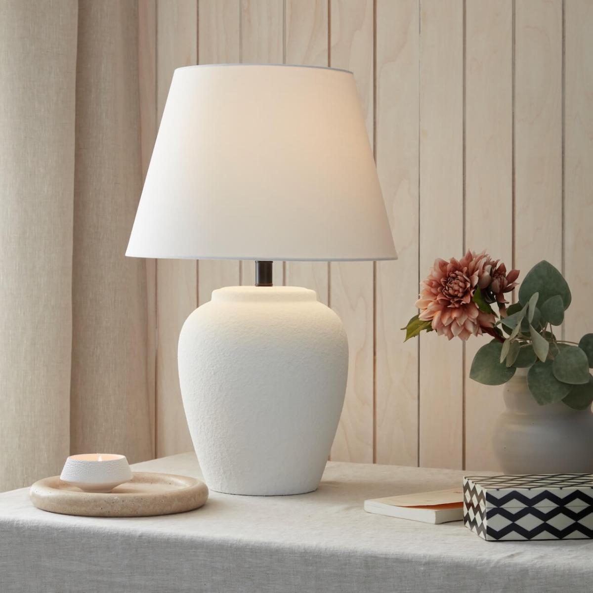 I love this white ceramic lamp and shade for its clean, understated aesthetic, making it incredibly versatile across various interiors. It works particularly well in minimal, Scandi, or coastal schemes where its simple form complements natural light and neutral palettes. For styling tips, try pairing it with textured accessories or layered lighting in a living room or bedroom to add warmth and depth without overpowering the space. It’s also a great choice for side tables or console setups, where its proportions and muted colour can enhance rather than clutter. Practical tip: keep the shade clean to maintain its crisp appearance and consider dimming options for softer ambient light.