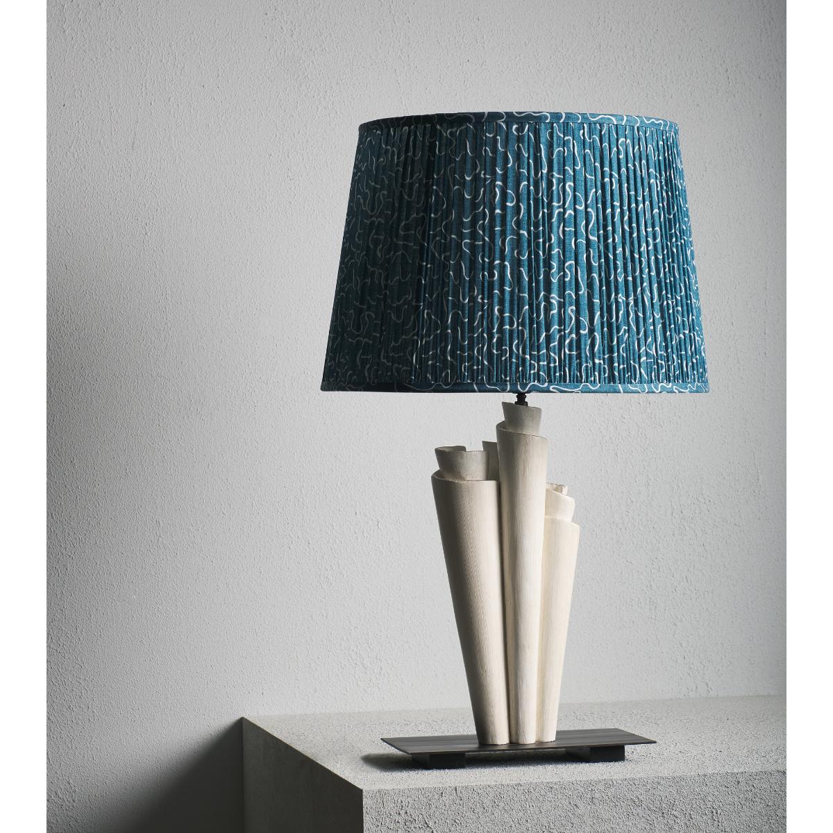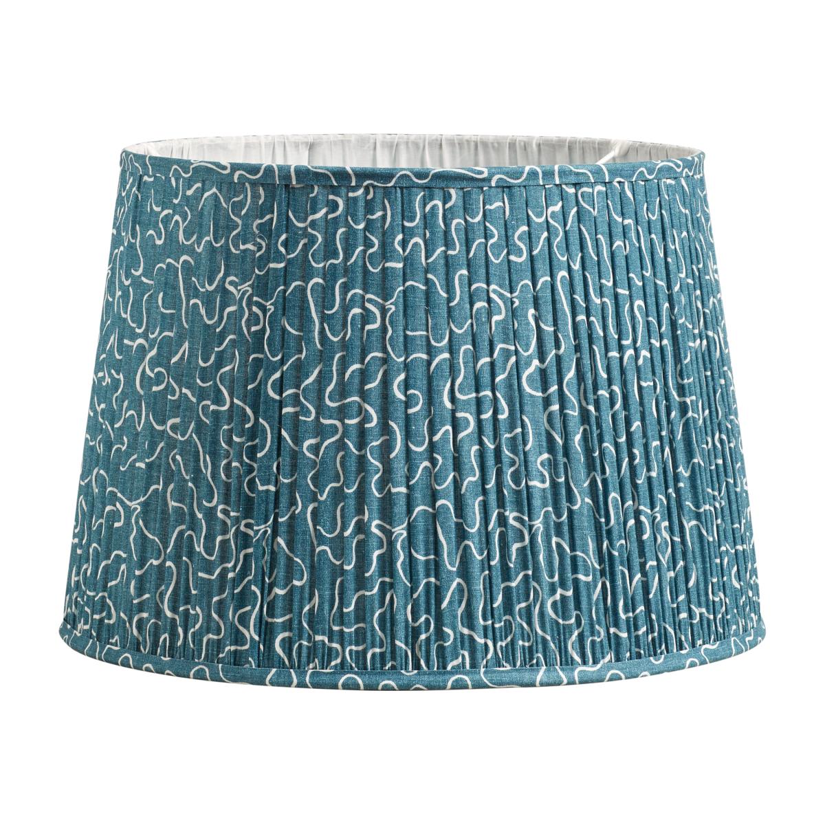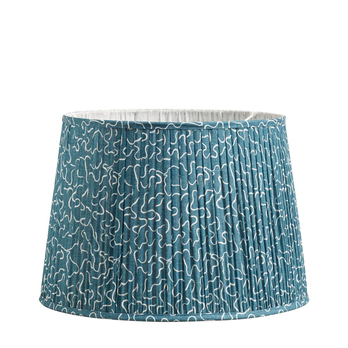 The deep aquatic blue linen pleats, which finish the handmade frame of the Leptoria Drum Lampshade, adds depth and tone to a table or floor lamp. The textile finish – which is printed in the UK – takes inspiration from abstract patterns found in nature, as well as the ornamental endpapers you might find in antique books.