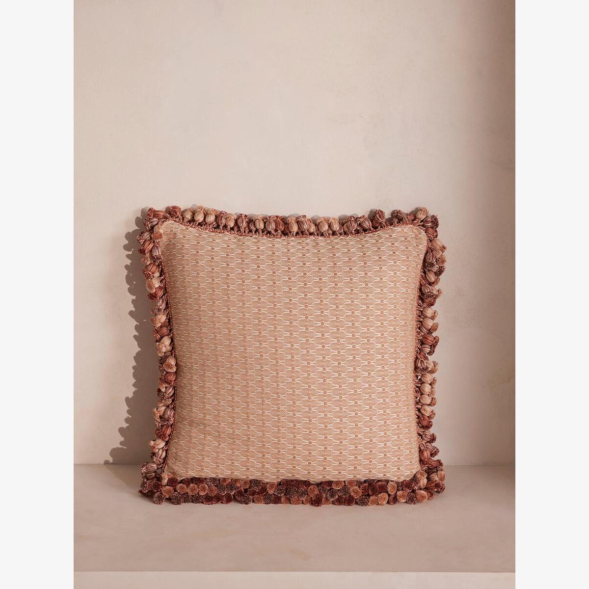 Crafted by hand, this cushion features an in-house jacquard design. Inspired by textiles found in Kettner's and Soho House Paris, our Lera cushion has been handcrafted in India from a cotton blend with tassel trims and a soft rose colouring, matching our Lera bedspread.
