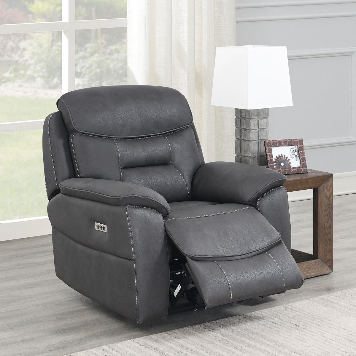 * Low maintence fabric* Electric reclining function* USB charger* Chrome finish button functions* Extra padded arm and head rest Sink into the Leroy Electric Recliner Chair and enjoy your preferred level of comfort and cosiness. The Leroy comes with low-maintenance fabric, an electric reclining function, USB charger, chrome finish button functions, and extra-padded arm and headrest.