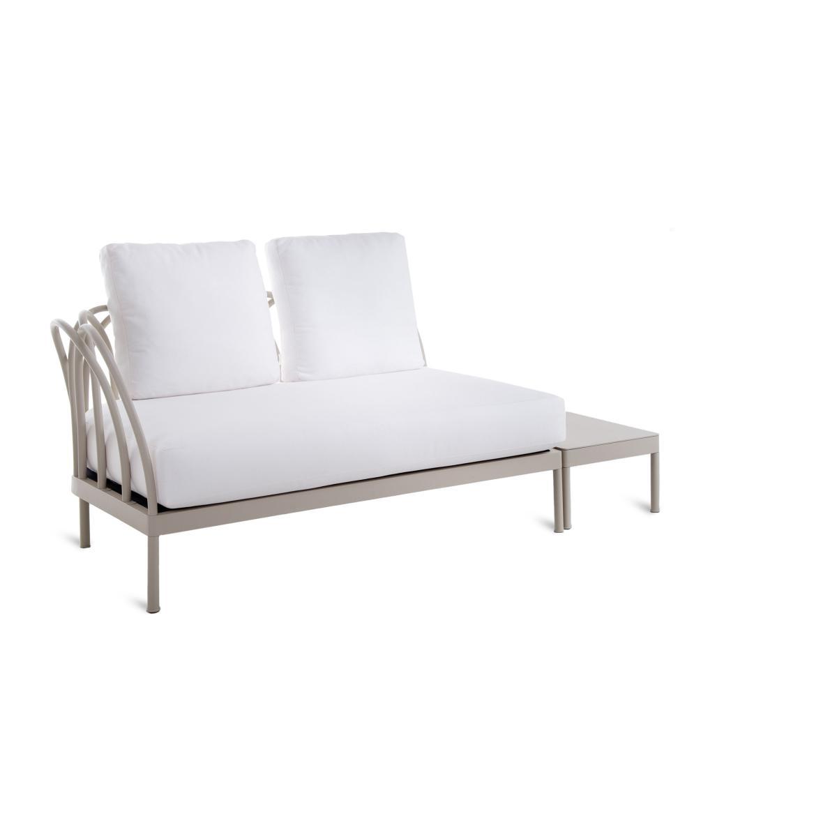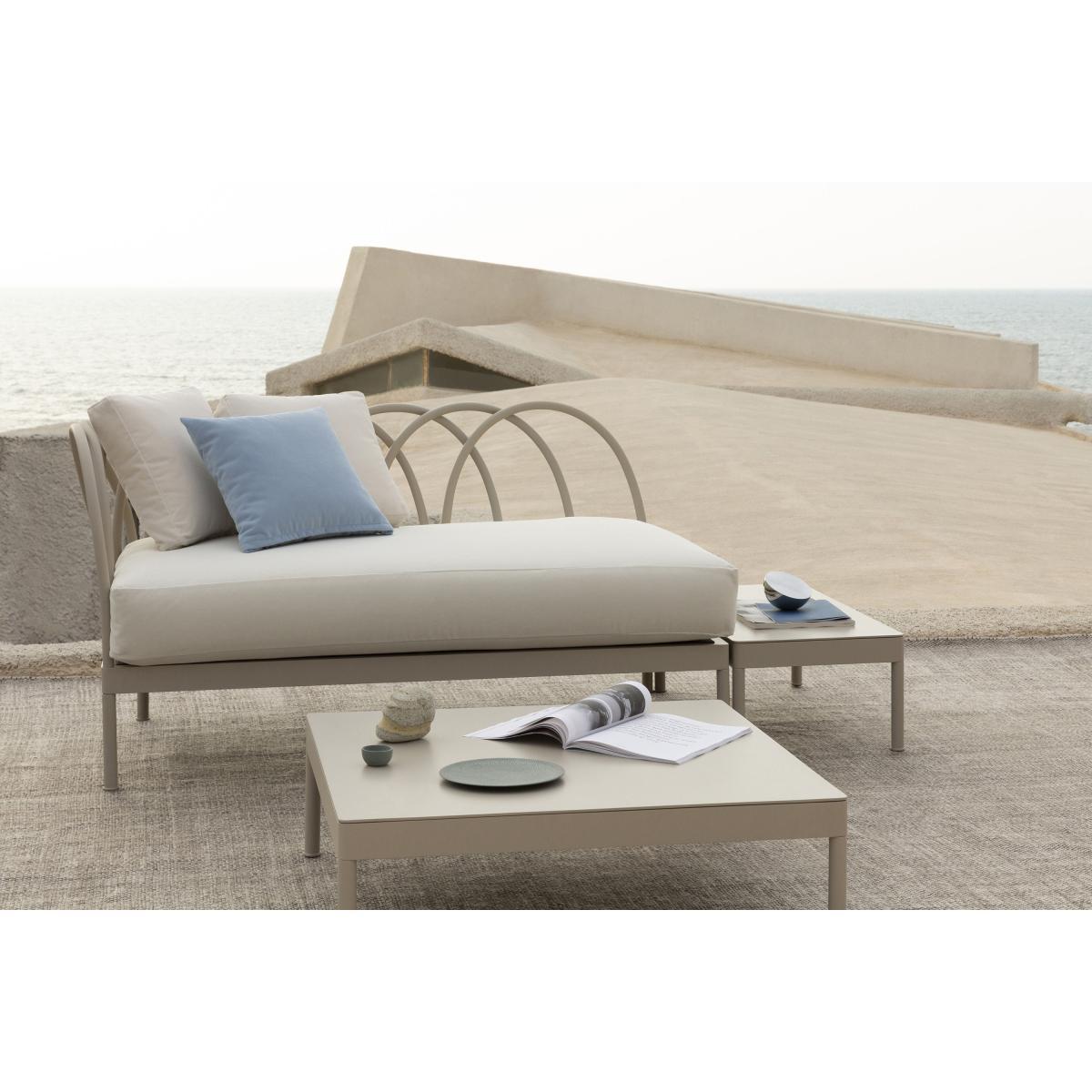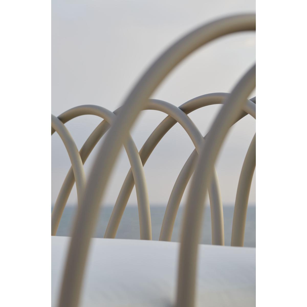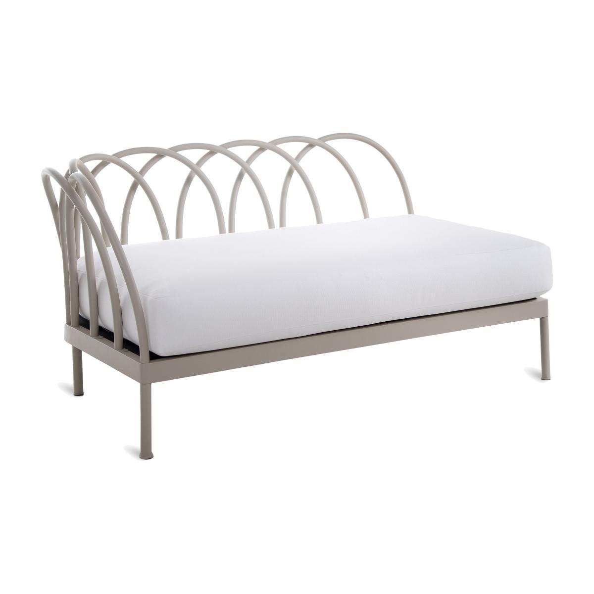 The curved lines traced by the aluminium characterise the "Les Arcs" outdoor furnishings collection. A combination drawing plentiful inspiration from retro lines and contemporary minimalism, this collection is reminiscent of the cast-iron armchairs that were so loved in the 1950s. The intertwined aluminium tubes create superb loops and arabesques. The repeated geometric patters form an openwork structure, which is well-balanced and stunningly light. With its hybrid style, blending deliciously passé romanticism with modernity, the Les Arcs collection brings it poetry to both your interiors and exteriors. This furniture will be perfect for adding touches of style and a dash of irony into a living room, garden, or terrace. The aluminium gives this furniture a unique lightweight aspect which makes them not only elegant and refined, but also practical. They're resistant to sun exposure, rain and wind, are easy to move and reorganise and, most importantly, they add a stunning touch to any space. Seat cushion included (small backrest cushions not included).
