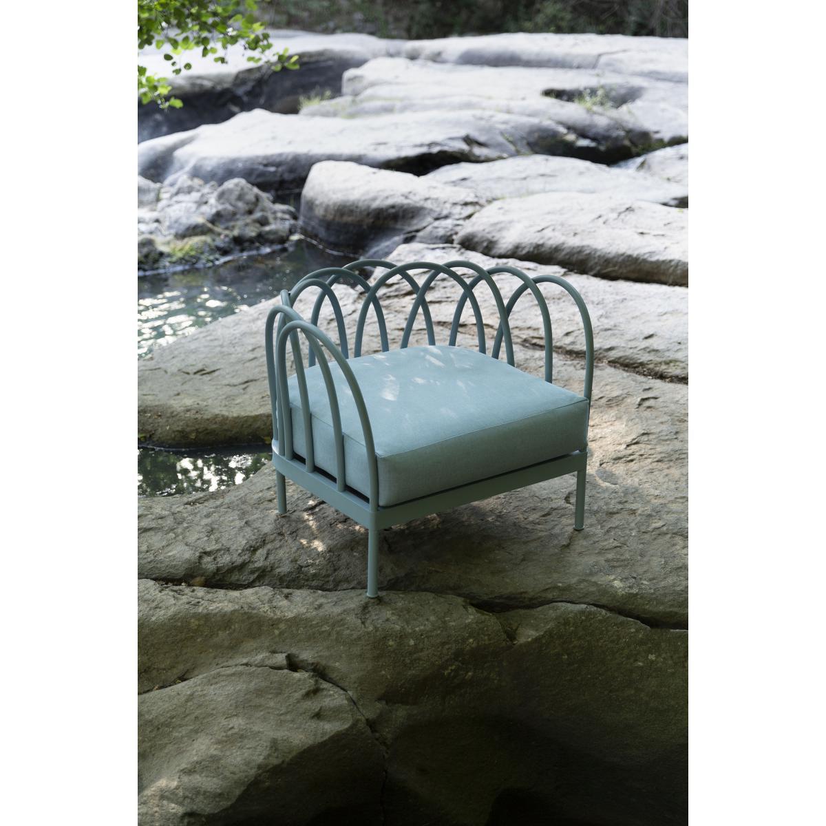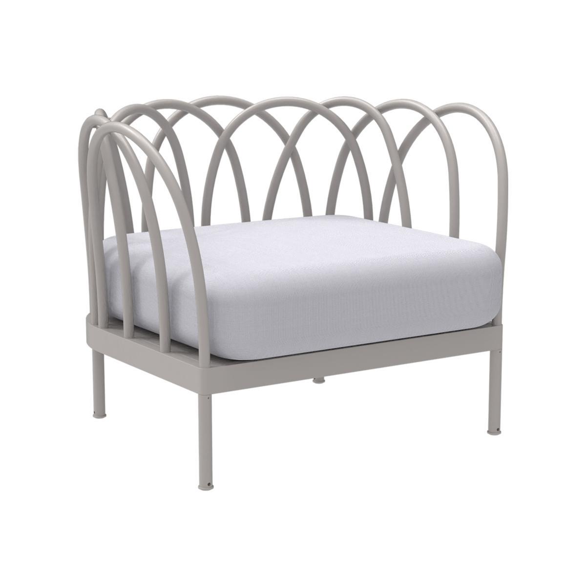 The curved lines traced by the aluminium characterise the "Les Arcs" outdoor furnishings collection. A combination drawing plentiful inspiration from retro lines and contemporary minimalism, this collection is reminiscent of the cast-iron armchairs that were so loved in the 1950s. The intertwined aluminium tubes create superb loops and arabesques. The repeated geometric patters form an openwork structure, which is well-balanced and stunningly light. With its hybrid style, blending deliciously passé romanticism with modernity, the Les Arcs collection brings it poetry to both your interiors and exteriors. This furniture will be perfect for adding touches of style and a dash of irony into a living room, garden, or terrace. The aluminium gives this furniture a unique lightweight aspect which makes them not only elegant and refined, but also practical. They're resistant to sun exposure, rain and wind, are easy to move and reorganise and, most importantly, they add a stunning touch to any space.