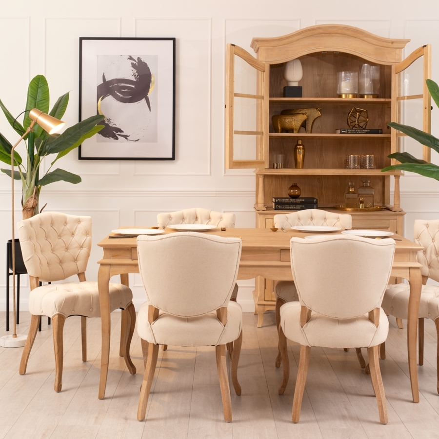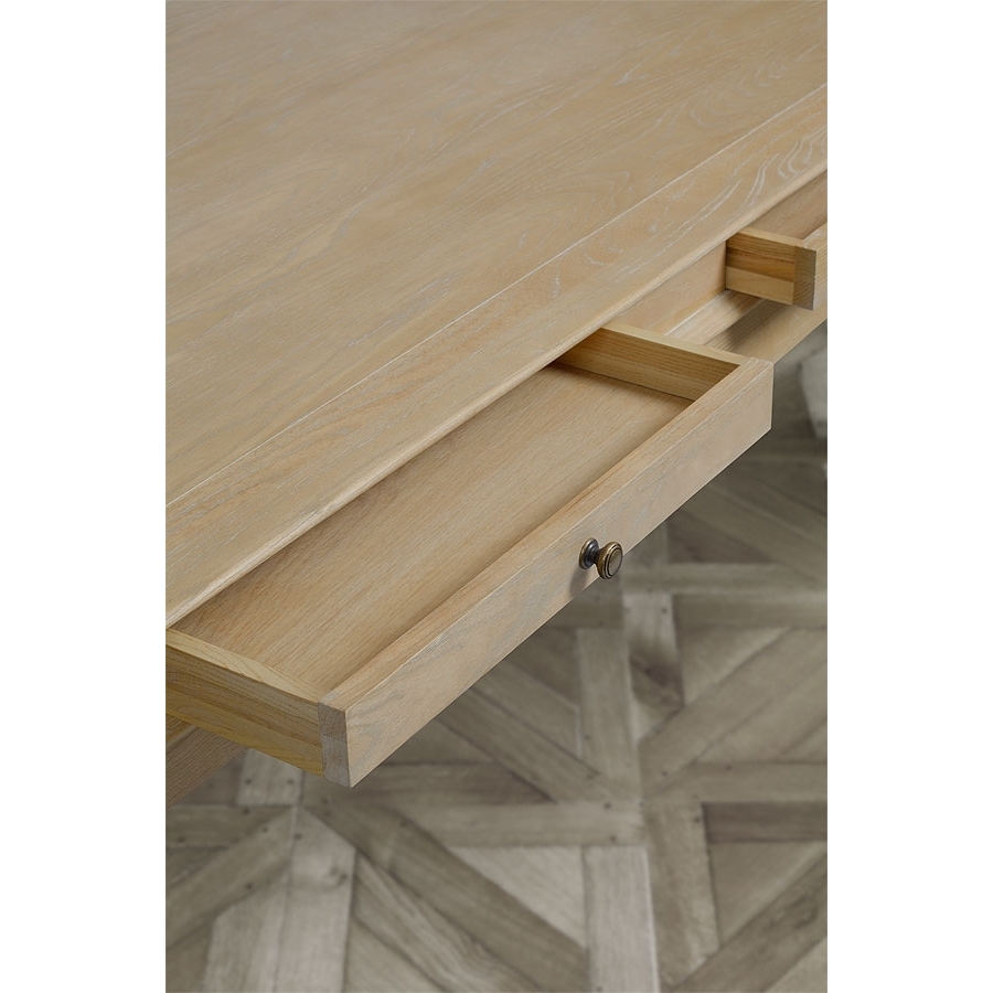 This beautiful piece of furniture will add character to any interior - commercial or residential. The skilfully hand-crafted solid oak table has been subtly lime-washed creating a convincing vintage appearance. Featuring four shallow drawers suitable for storing placemats, table linen, candles and cutlery. Will comfortably seat six people. Completed with antique effect solid brass handles. Part of the extensive Les Milles range which includes bedroom, living and dining room furniture. Will co-ordinate with any of our French Vintage dining chairs. Supplied fully assembled.