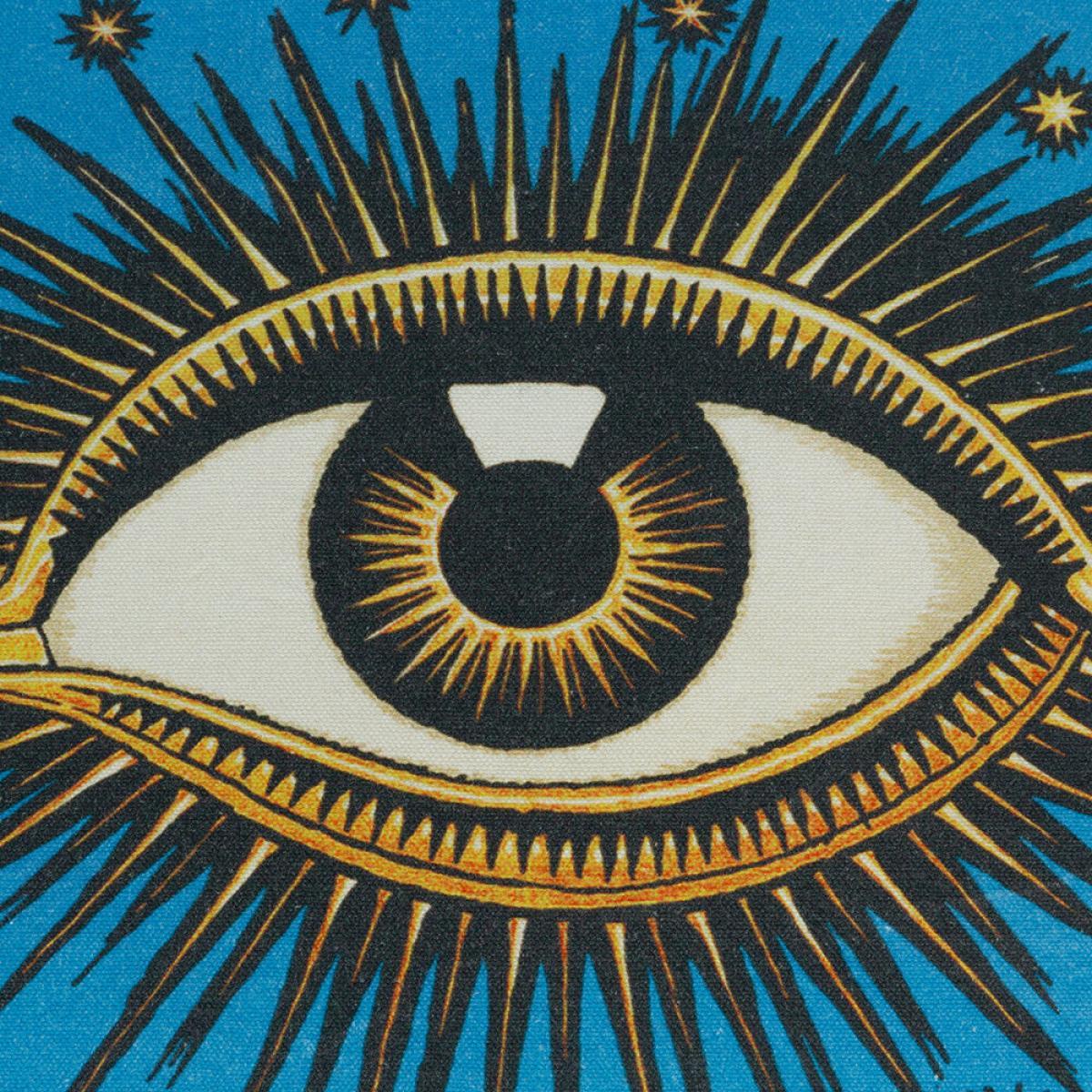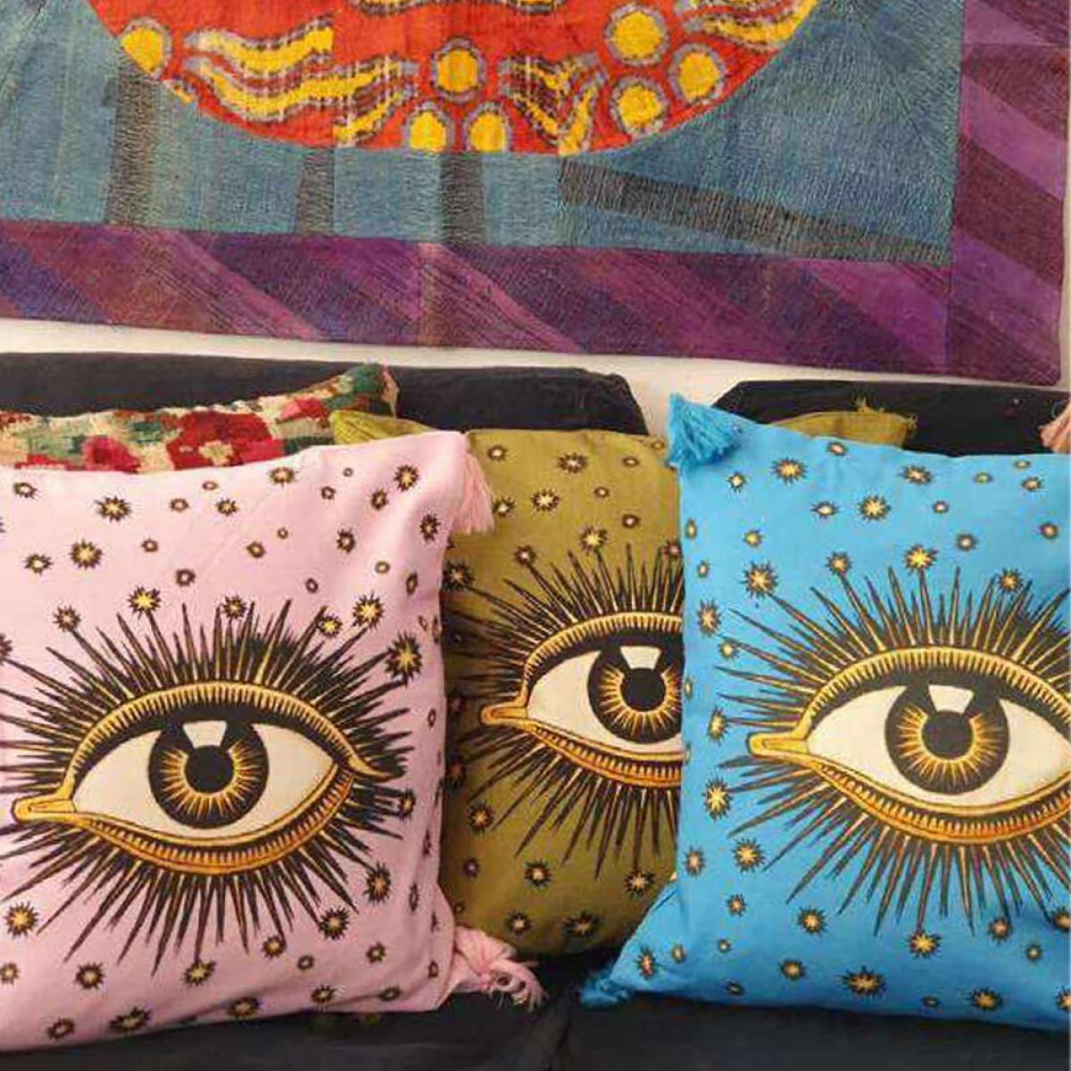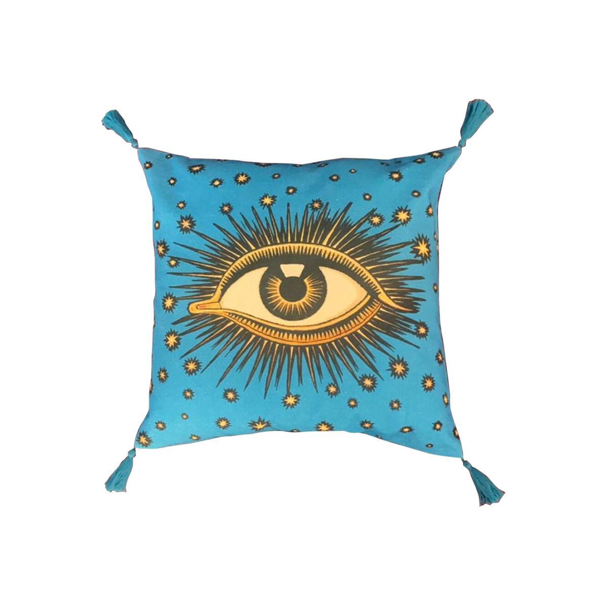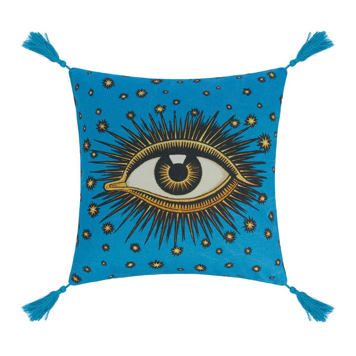 Add a mystical touch to your interior with this Eye cushion from Les Ottomans. Made from cotton, it's been decorated with a striking eye design surrounded by stars and will add a magical touch for any setting. Key features: * Material: 100% cotton * Dimensions: 45x45cm * Eye design * Surrounded by stars * Blue colourway * Tasselled corners