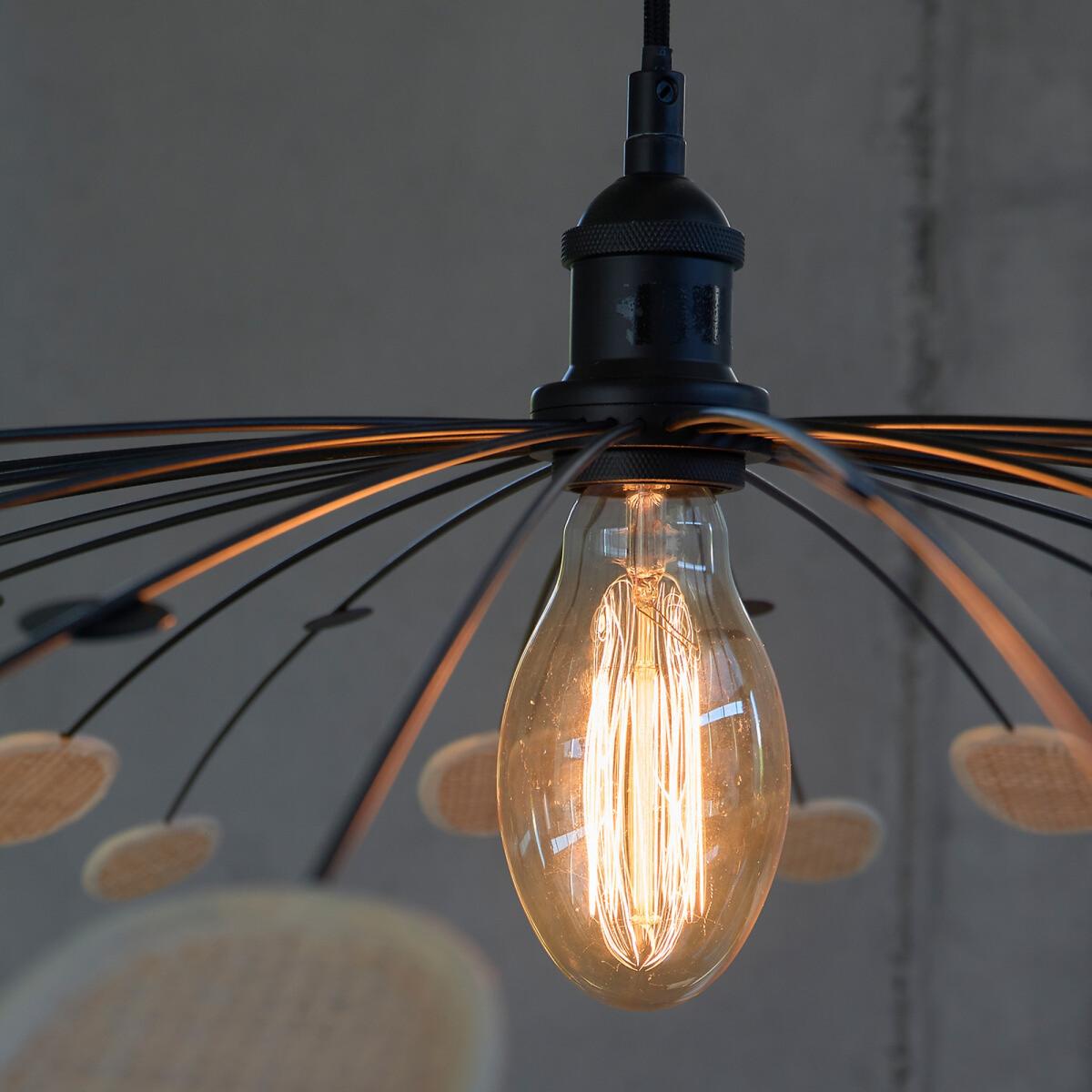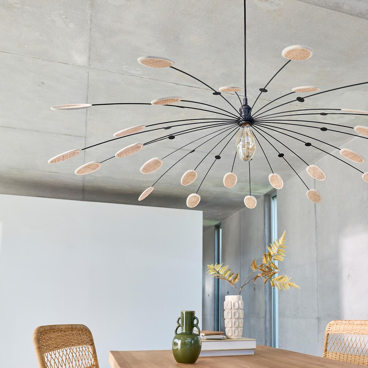 I love this pendant because it combines sleek metal with a touch of natural cane detail, creating a modern yet warm aesthetic. Its large 138cm diameter makes it an eye-catching feature perfect for open-plan living spaces or a statement above a dining table. It works well in contemporary interiors, especially in minimalist schemes, but can also add a touch of organic elegance to boho or industrial styles. As a styling tip, consider hanging it at a height that allows the leaves to cascade naturally without overwhelming the space, and pair it with warm-toned bulbs to enhance the organic feel. This light is versatile enough to act as a focal point or complement simpler decor themes, adding both visual interest and functional illumination.