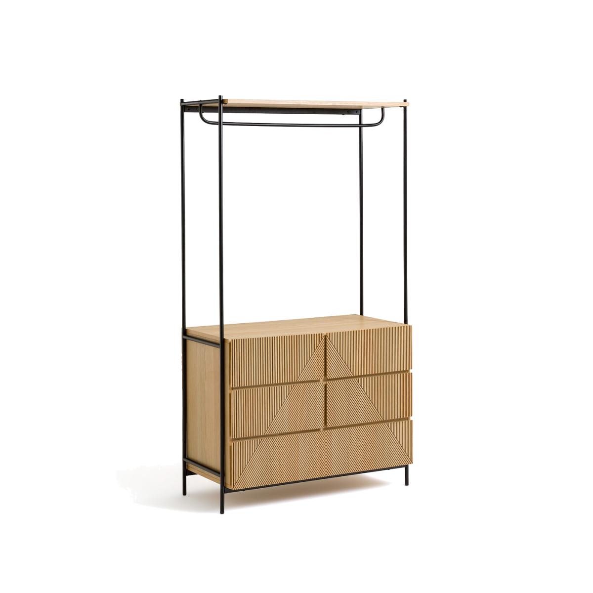The Lodge Wardrove Module is part of the La Redoute Signatures Collection. A selection of exclusive creations, designed by our in-house design studio. Inspiring, easy to live with, trendy... these products have become our customers' favourites. and no doubt yours!. Designed internally by Aurore Delest : "To create the Lodge dressing module, I wanted to combine vintage with ethnic influences, notably with carved wood. The streaky wire drawing brings rhythm for a graphic spirit and a contemporary style. "The different dressing modules in the Lodge range allow you to easily put together your dressing room. Product Details • 1 hanging rail • 4 small and 1 large drawers • Structure in black metal tubes with epoxy finish, matte effect • Unit and drawers in oak veneered MDF with nitrocellulose varnish finish • FSC® certified woodDimensions. Total: • Width: 104.2cm • Height: 190.7cm • Depth: 50cm. Usable dimensions: • Height of hanging section: 112.7cm • Interior dimensions of 4 upper drawers: L41.5 x H10 x D33cm • Interior dimensions of lower drawer: L92 x H10 x D33cm • Height of legs: 12.7cm • Weight: 67.2kgDelivery:. Assembly required. Available for home delivery. Note! Please check that all access points are large enough to accommodate your delivery (doors, stairs, lifts). • WOOD FROM SUSTAINABLY MANAGED FORESTS. FSC® certified wood comes from forests that are environmentally, socially and economically well managed. Dimensions and weight of parcel2 parcels • L199.5 x H19.5 x D52cm. 16.7kg • L109 x H22 x D73.5cm. 59.1kg