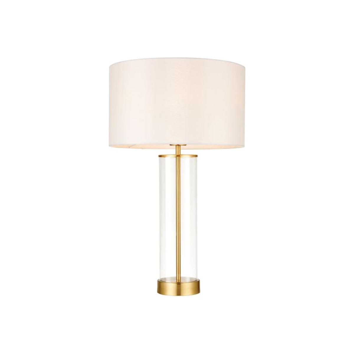 Beautifully simple table light with a clear glass base, vintage white faux silk shade and a brushed gold effect finish. Dimmable via a clever 3 stage touch dimmer.
