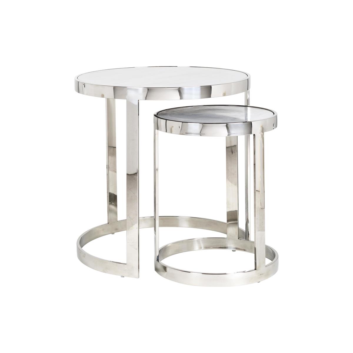 The practical nest of tables gets a stunning new look in the Levanto round nest of tables. Beautifully made from high-quality materials, this set of two circular tables features real marble table tops, each one uniquely coloured and with authentic mottling and graining. These nesting tables are set on curved stainless steel bases that stylishly interlock for a beautifully finished yet neatly minimal look. Tables are generously proportioned and yet, when nested together, are a space-saving way to bring useful occasional furniture into your living space. The Levanto round nest of tables is part of the Levanto collection of dining and occasional tables with real marble tops and geometric-inspired stainless steel bases. This set of tables perfectly complements the Levanto round coffee table. Marble has beautiful variations in finish and unique markings.