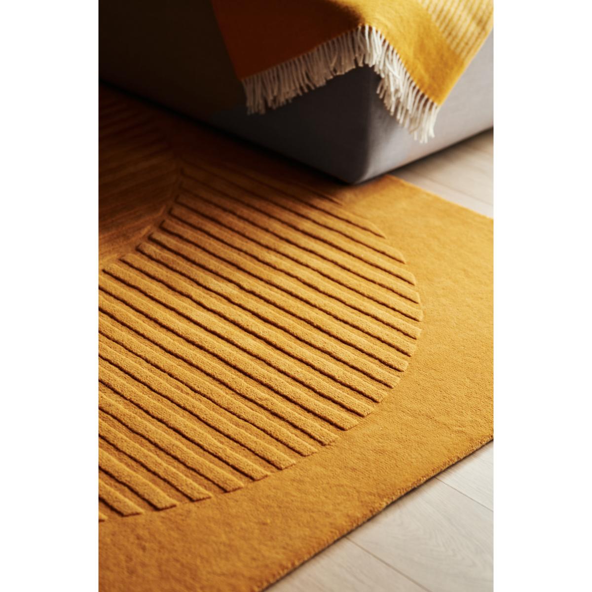 I love this yellow wool circle rug for its bold colour and textured design, making it a standout feature in any space. It works particularly well in modern or minimalist interiors, where its vivid hue can add warmth and personality without overwhelming. Practical styling tips include placing it beneath a coffee table or in a lounge area to create a focal point, or using it to add colour to neutral-toned rooms. Due to its size, it pairs nicely with contemporary furniture, and layering it with smaller rugs can help define different zones within open-plan spaces. Its durable wool construction also adds a cosy, inviting feel underfoot, making it both functional and stylish.