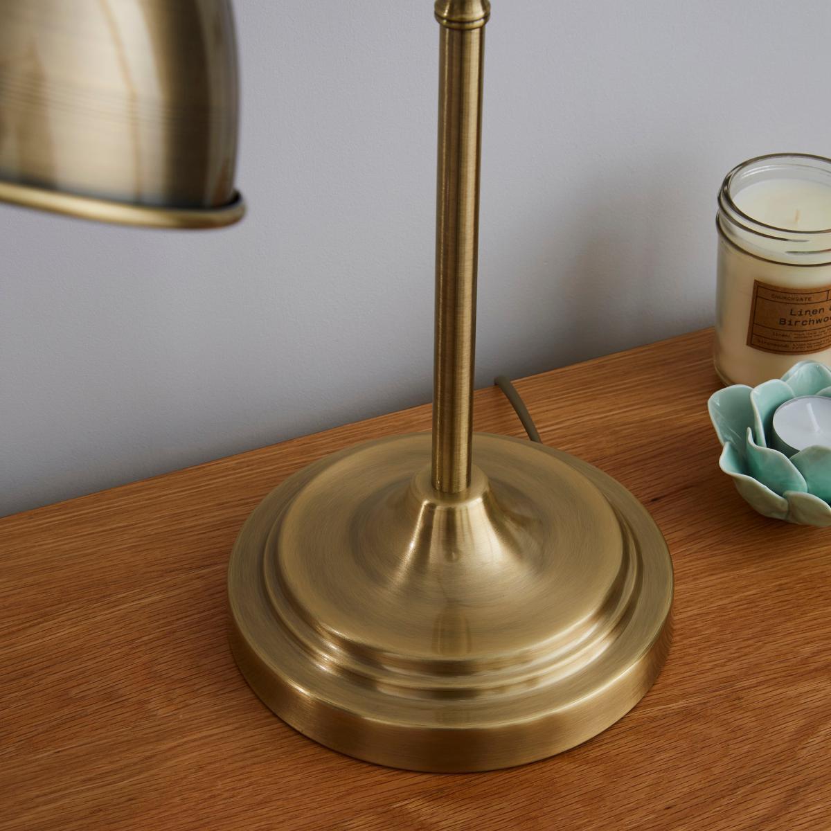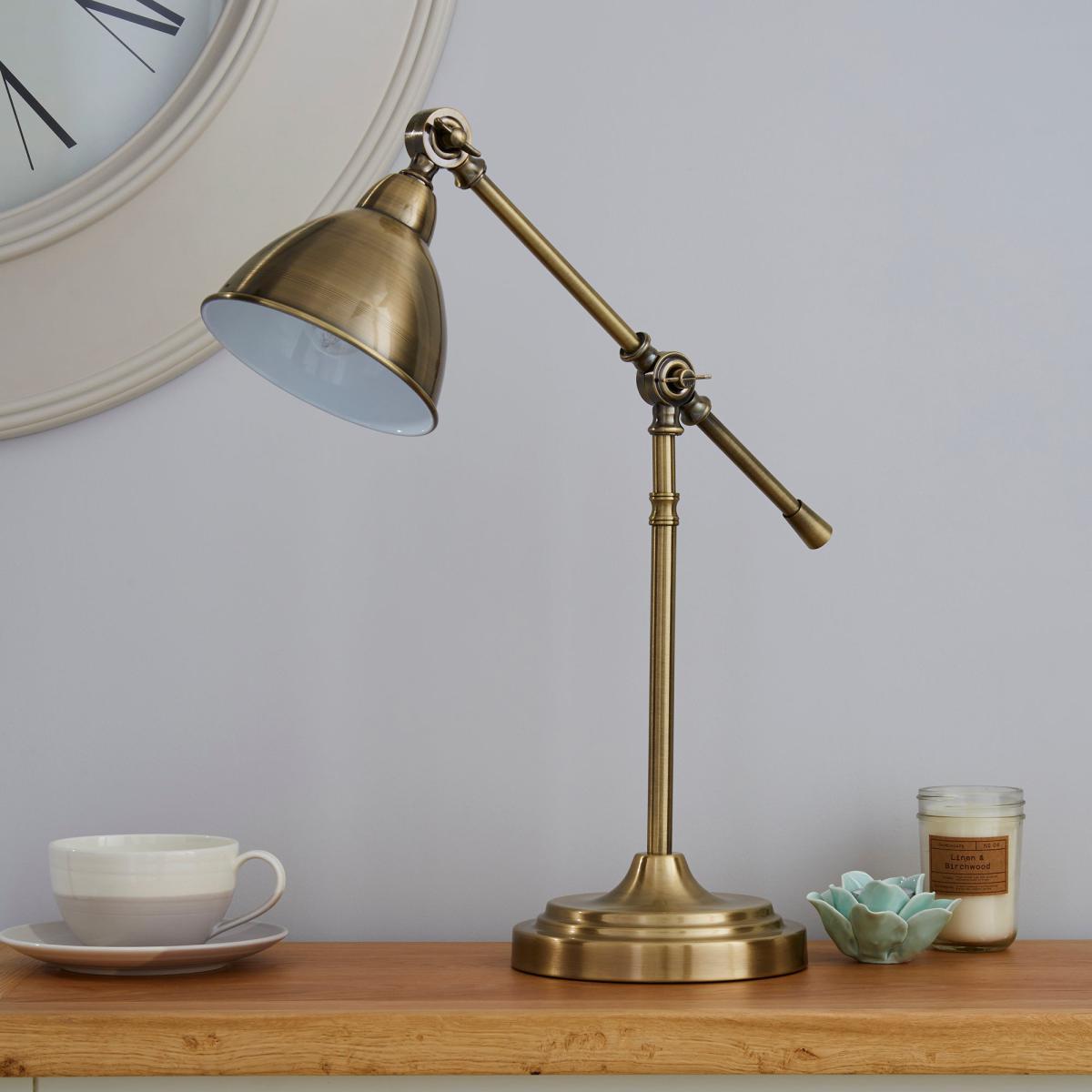 Add a touch of class to your interior with our antique brass lever arm table lamp. Featuring a handy lever that enables you to adjust the height of the lamp, it offers a sleek and modern design. Perfect for adding practical lighting to your office or living space, it will suit a host of interiors. Please note that bulbs are not included with this light feature.