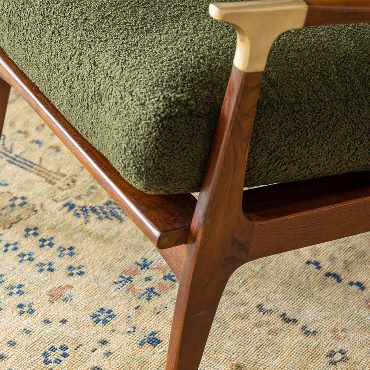 A perfect accent chair for the living area, dining room, study or bedroom, our mid-century influenced Levi Armchair in Olive Green features a comfortable upholstered seat and supportive slatted wooden backrest covered in on-trend deep green boucle. The solid acacia wood frame has a traditional warm Danish look, blending a softly curved armrest with brass finish tips on both arms and feet. Pair with our matching Levi footrest for a quiet spot to relax and read.