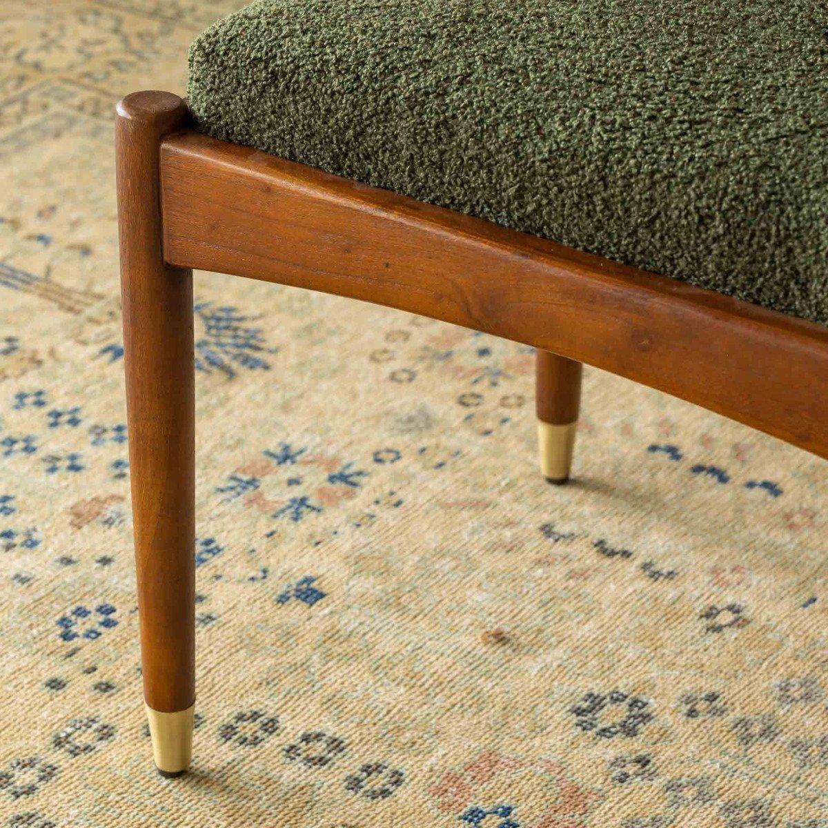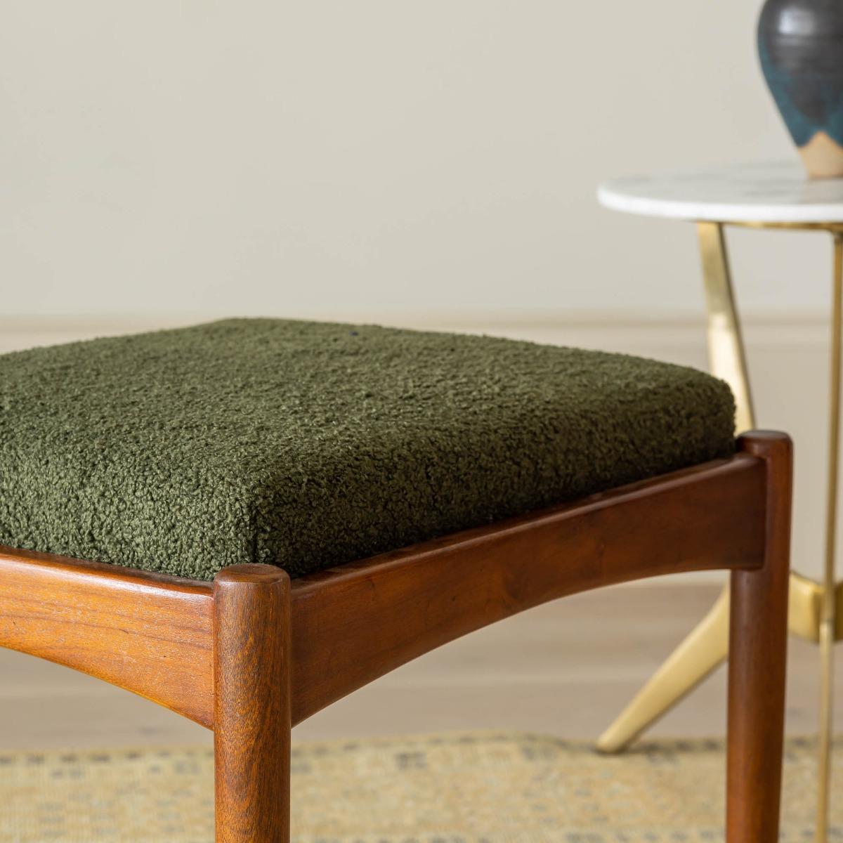 Our Levi Footstool in Olive Green Boucle is the perfect pairing for our Levi Armchair. This mid-century inspired design features an upholstered pad with a solid acacia wood frame and brass finished leg detail for a traditional Danish look and feel.