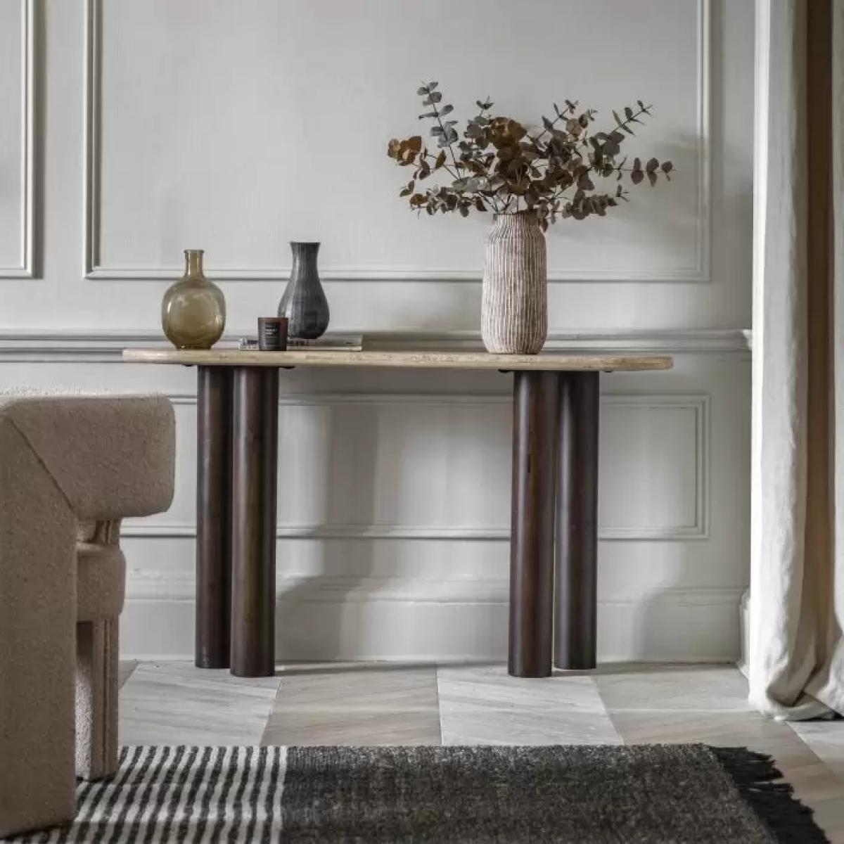 This stunning console table features turned cylindrical legs, crafted from mango wood solids, paired with a solid travertine stone top which has a natural finish. Matching pieces are available. Material:Mango Wood 55% / Travertine 45%. Colour/Finish: Dark Wood.