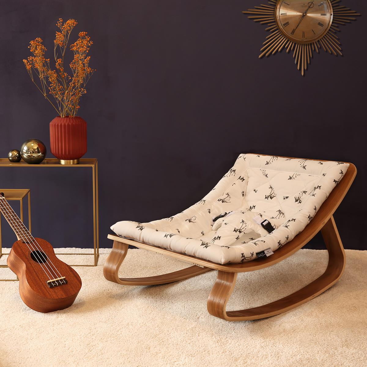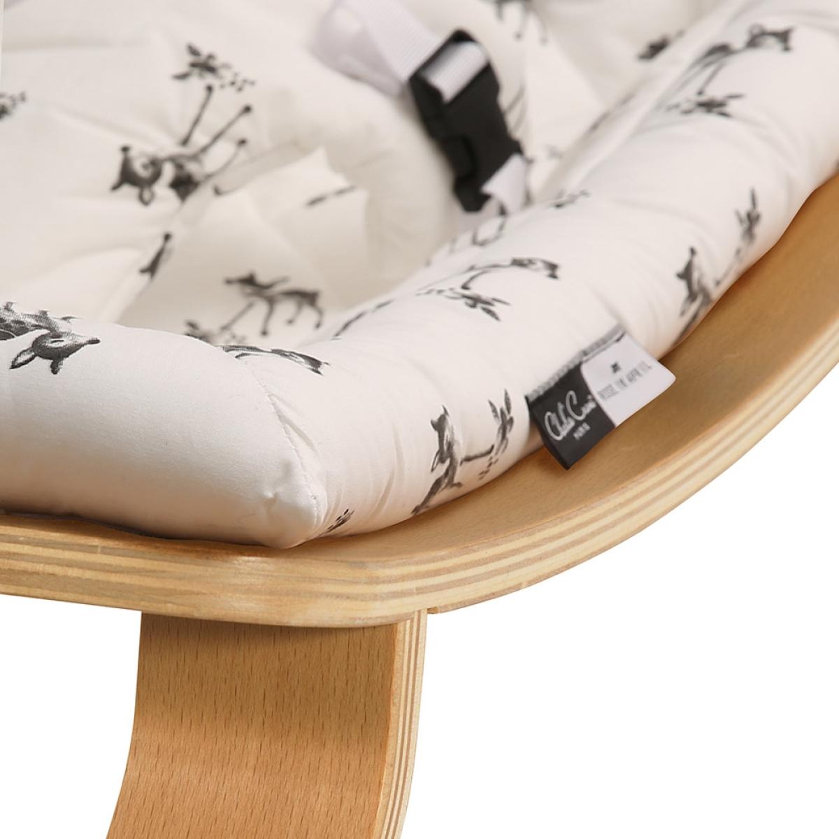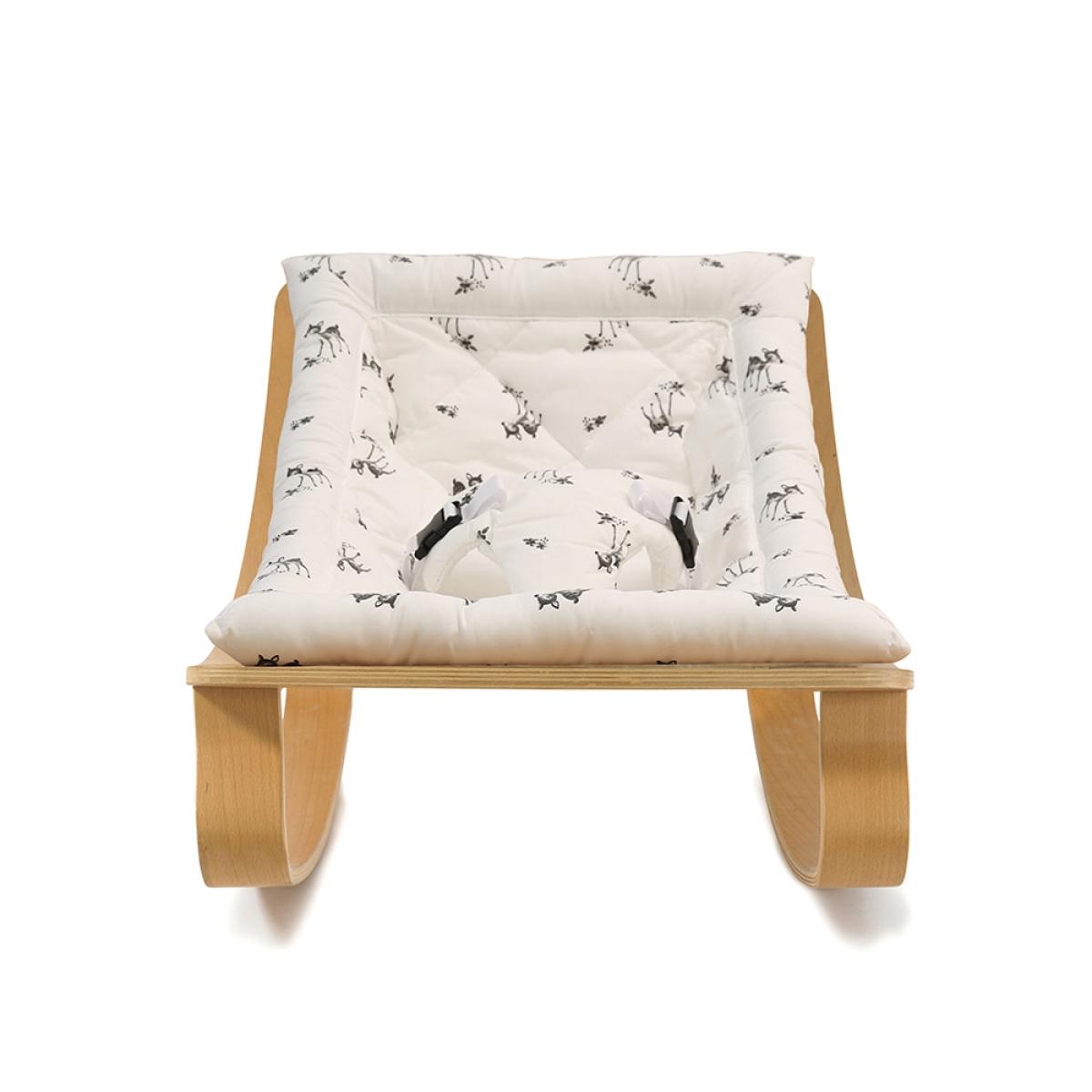 This delightful Levo Baby Rocker. In Beech Wood with Rose in April Fawn Cushion. By Charlie Crane has quite simply taken our breath away here at Cuckooland. It is just gorgeous! We all want one; even those of us who don’t have babies! The rocker follows your baby’s own natural movements, encouraging him or her to actively bounce rather than other models out there on the market that mechanically and regimentally rock baby, whether they want to move or not! Intended for little ones from birth until they are around 7 months old, this super stylish and exceptionally crafted rocking chair is a must have. Nursery room accessory. ! With 100% Cotton fabric cushions that come in other fabulous prints exclusively designed for Charlie Crane by Parisian artists, and a varnished wood finish, the Levo Baby Rocker is a thing of pure beauty! The tough decision is which one will you choose?!.