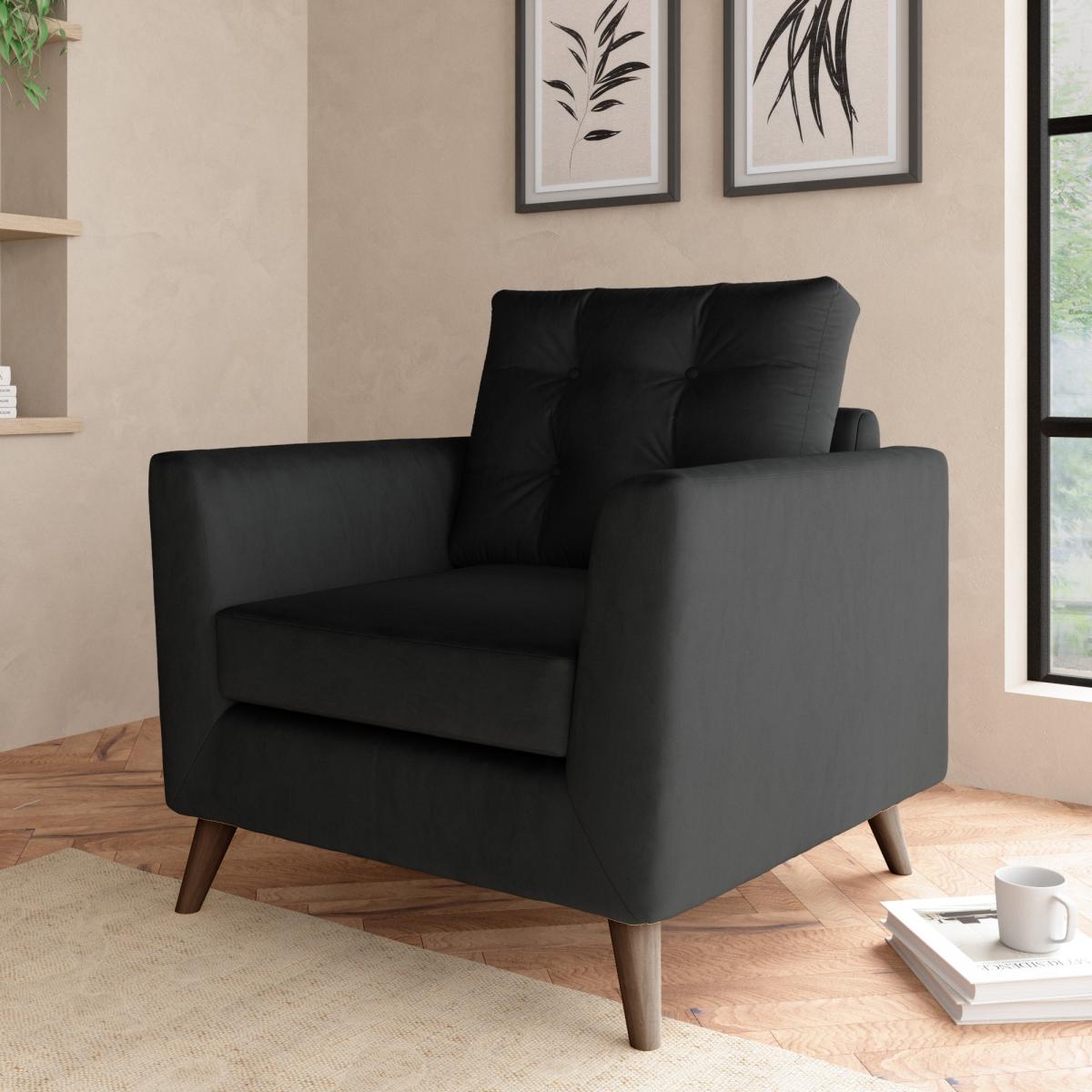 I love this armchair for its sleek, modern silhouette and the luxurious velvet finish, which instantly adds a touch of sophistication. The black hue makes it versatile enough to slot into various interiors, from contemporary to industrial styles, while the plush cushioning offers both comfort and style. Practical styling tips include pairing it with neutral-toned cushions or metallic accents for contrast, or layering it with textured throws to soften the look in more eclectic spaces. Its classic shape and deep colour also make it a great anchor piece in a living room or reading nook, offering both practicality and elegance.