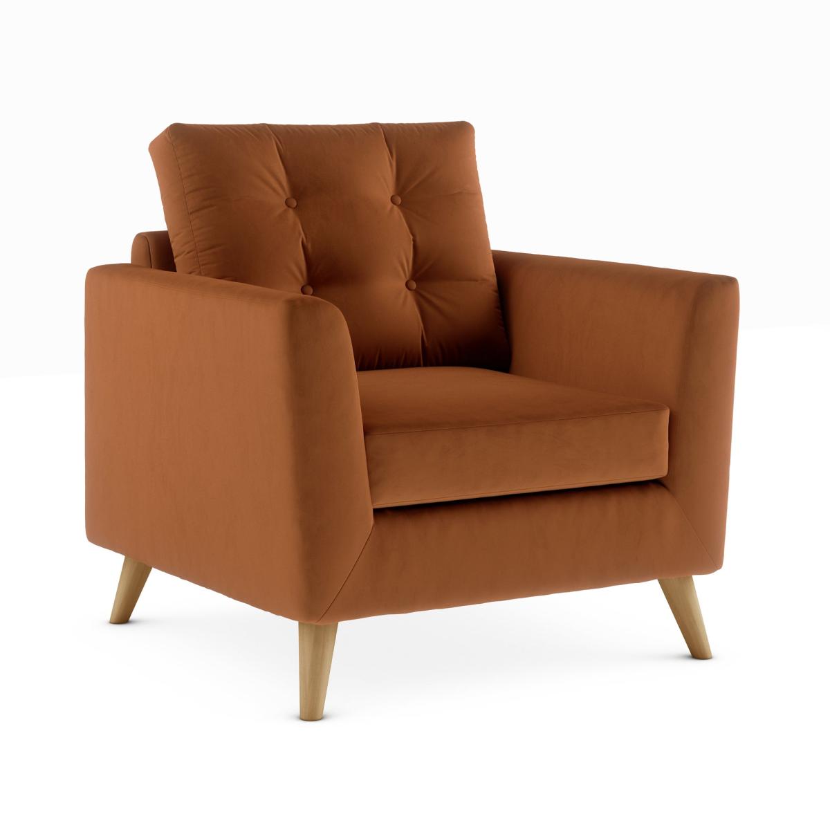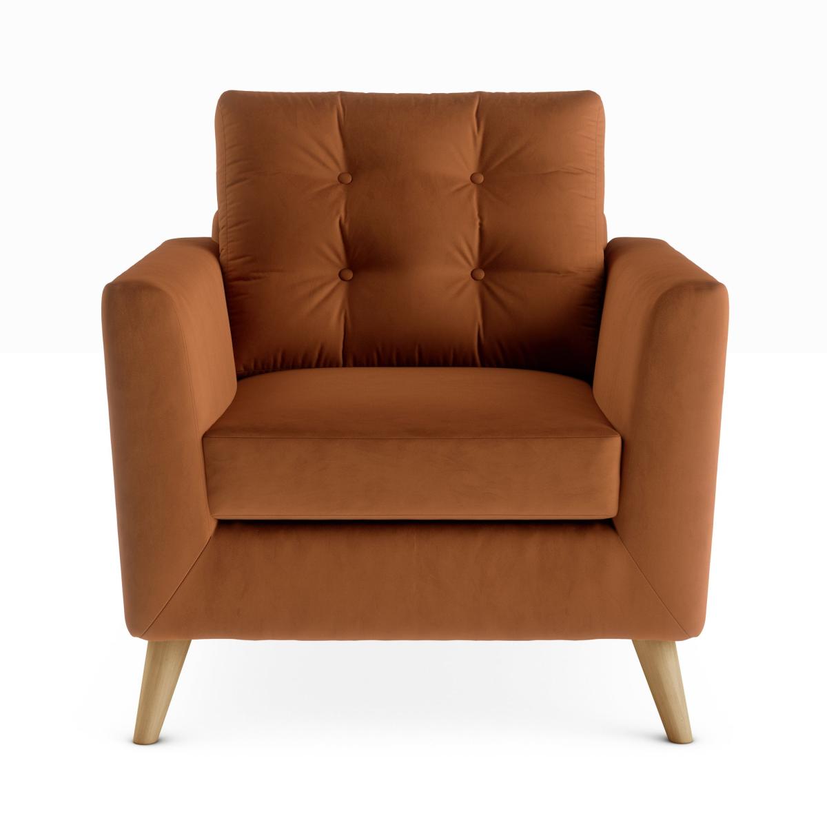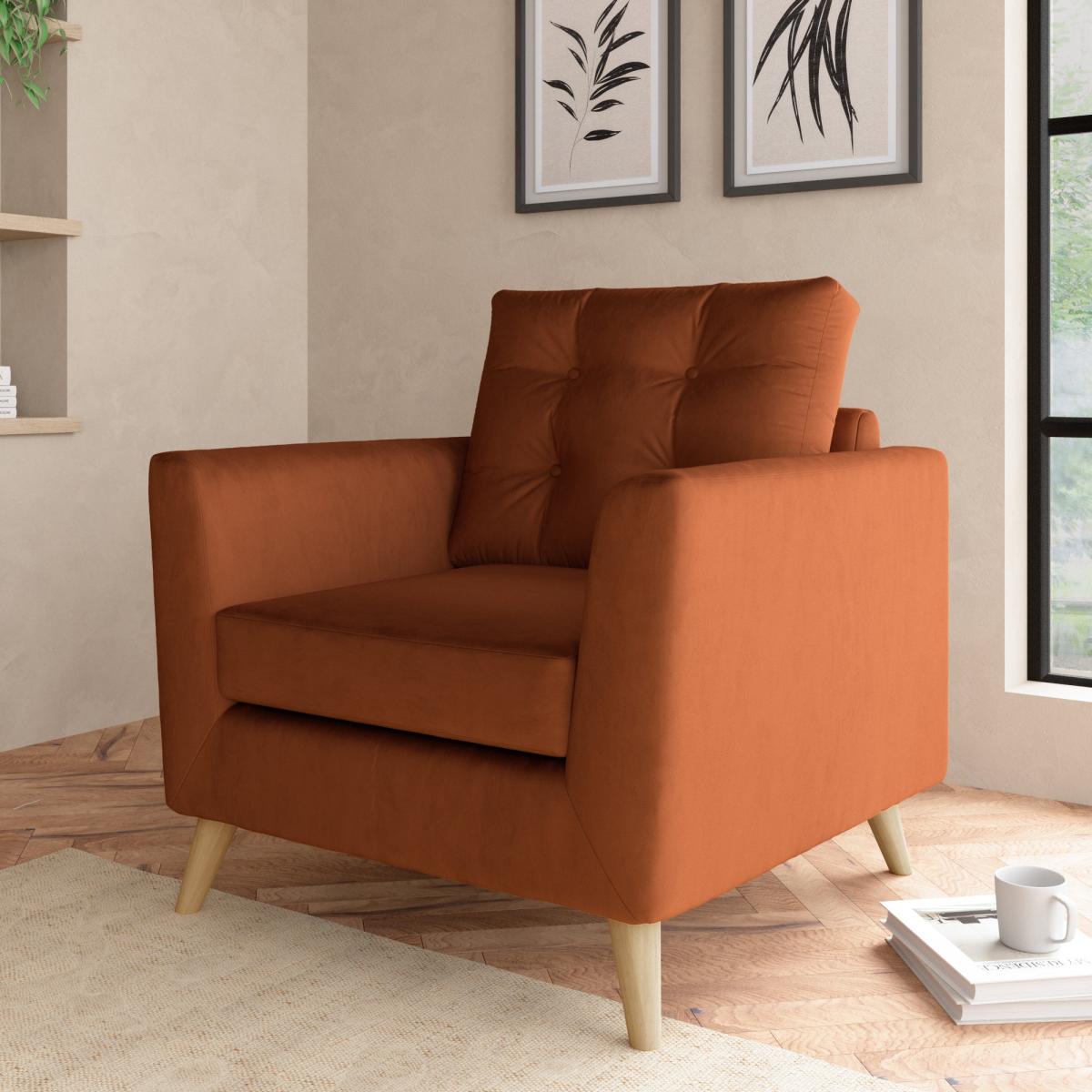 I love the Lewes armchair for its bold colour and contemporary silhouette, making it a versatile piece that can anchor both modern and more traditional interiors. The luxurious velvet texture adds a touch of sophistication, while the warm orange-umber hue brings a cosy, inviting vibe to any room. It's perfect for living rooms with neutral palettes, as it offers a striking colour pop, and works well in eclectic or retro styles when paired with textured fabrics and pattern-rich accessories. Practical styling tips include layering with cushions for comfort and pairing with wooden or brass accents to enhance its mid-century modern appeal. Keep the surrounding decor simple to let the chair shine or add complementary warm tones through rugs and accessories for a cohesive look.