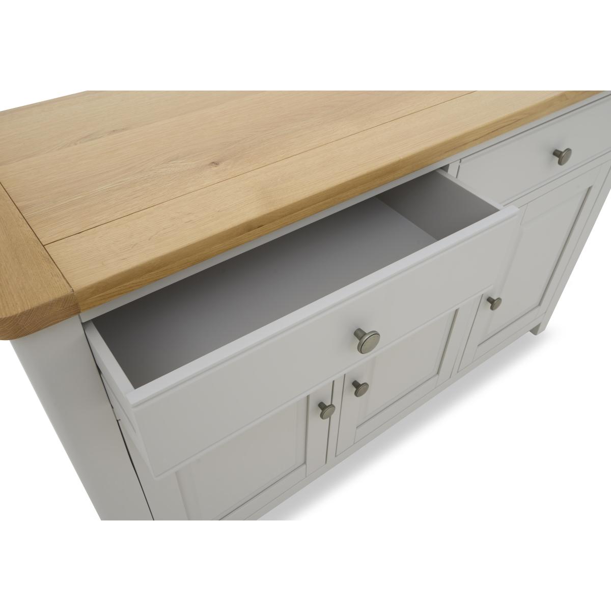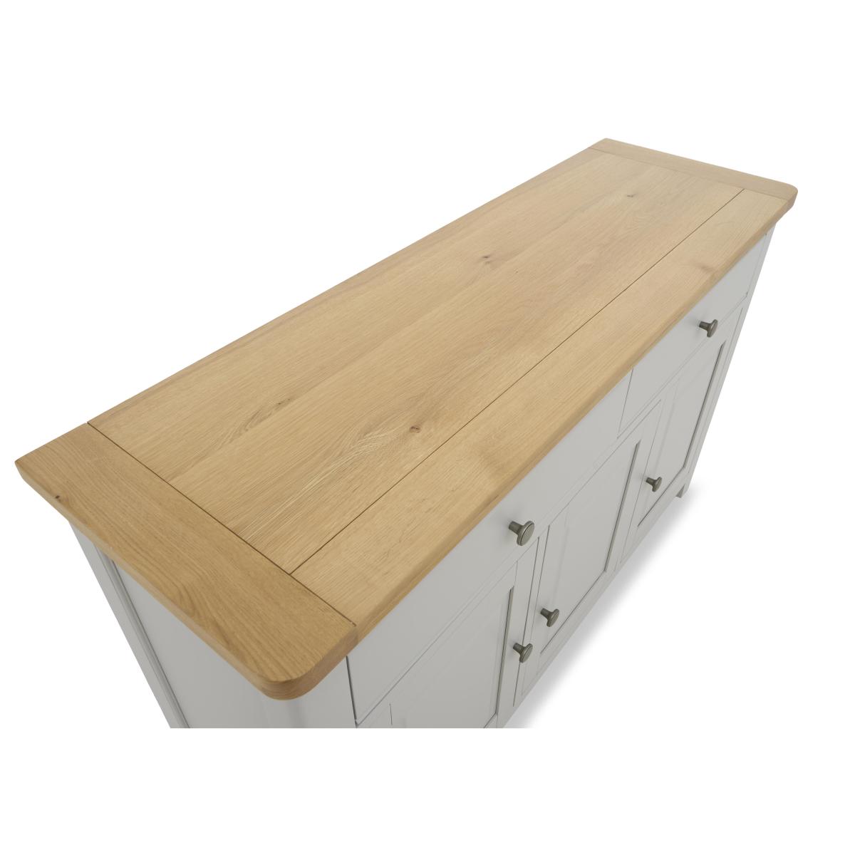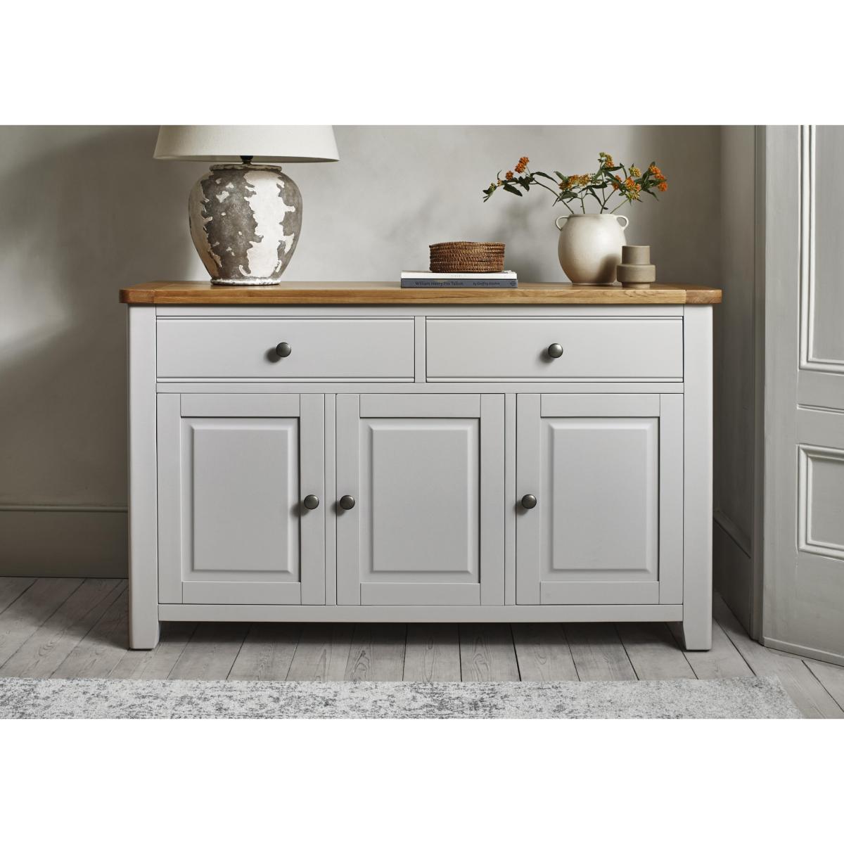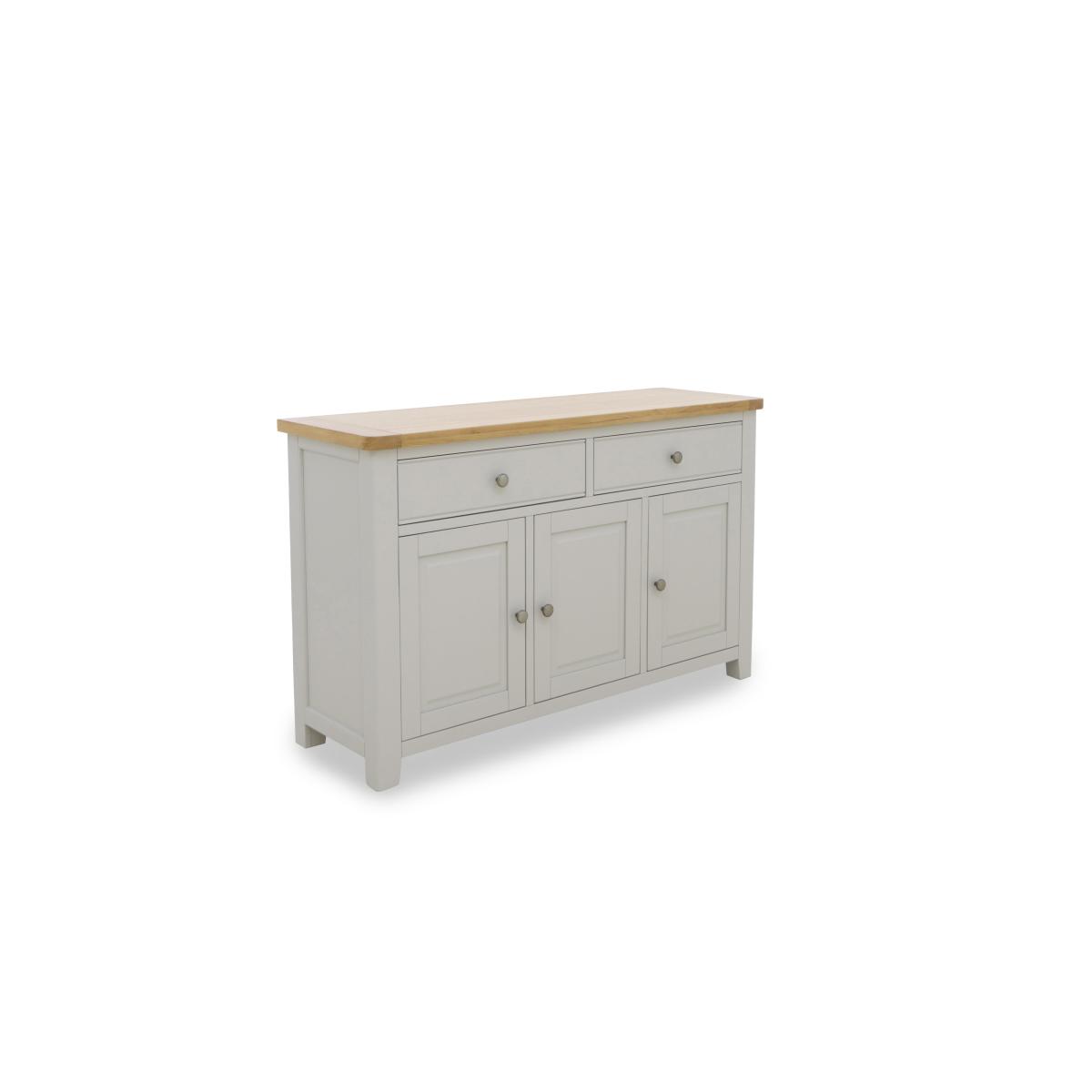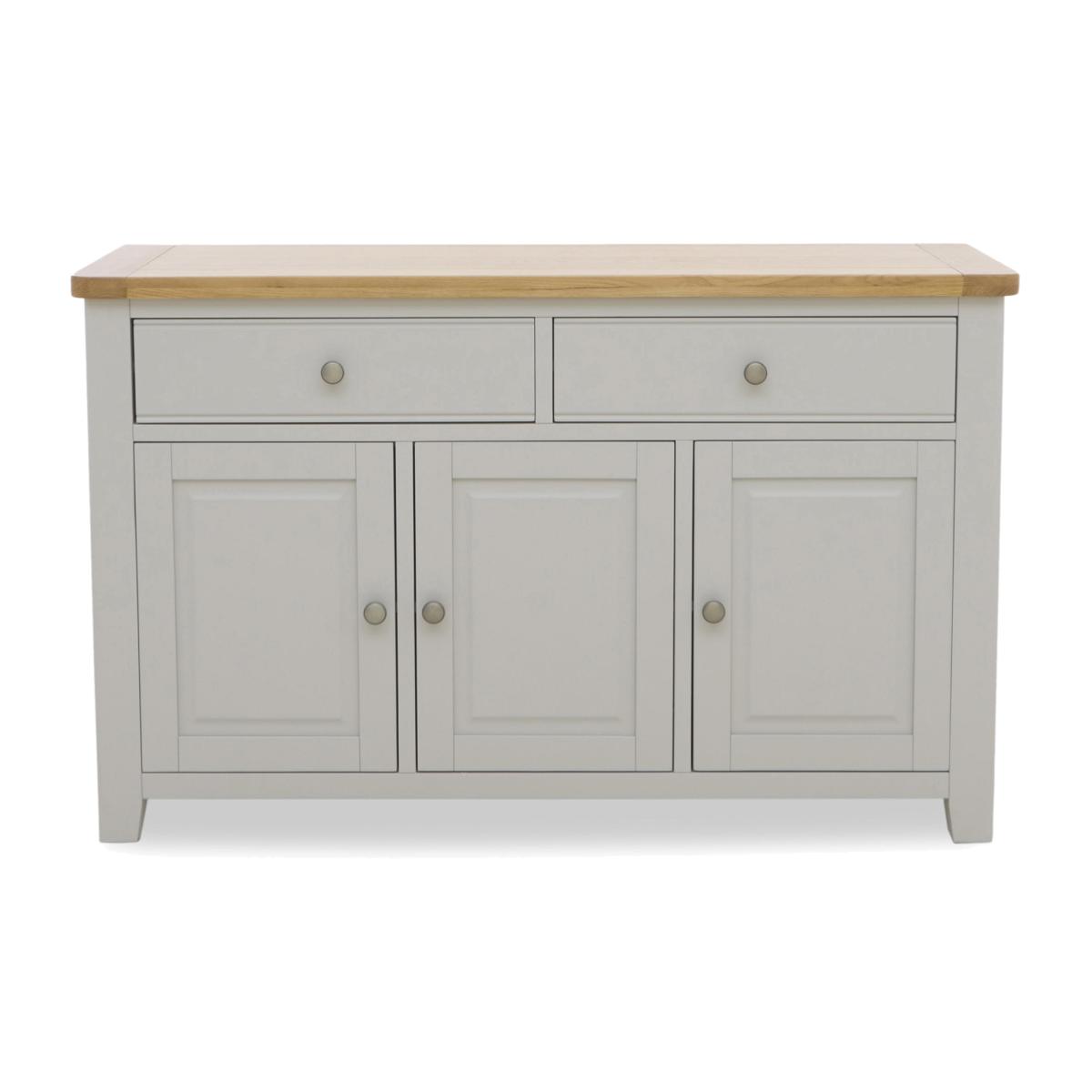 With its natural oak and soft grey painted finish, our expertly crafted Lewis three-door two-drawer sideboard delivers charm, style and family-friendly durability alongside truly exceptional value. Why you'll love it Lovely painted wood and oak furniture at an exceptional price. Soft grey finish is perfect for your modern country, Scandi style or coastal chic home. This 3-door 2-drawer sideboard is expertly crafted from oak, oak veneer and pine. The frame is painted twice for a beautiful and hardwearing finish. A clear lacquer protects and enhances the oak top. Timeless design with chunky lines and substantial proportions. Soft-close cupboard doors. Metal door and drawer handles. Only at Furniture Village. This 3-door 2-drawer sideboard is part of our Furnitureland Lewis range. What you need to know 1 double-door cupboard and 1 single-door cupboard, each with 1 adjustable shelf. Made with oak and pine. No two pieces of wood or veneer are the same. Variations in colour will occur. Avoid placing in direct sunlight or close to a heat source. We recommend using coasters and placemats at all times. Wipe clean with a damp cloth and then dry using a soft duster. Spills should be wiped immediately and the surface dried. Do not use silicon-based furniture polish or abrasive cleaners. WARNING! Item code: LWIS3SB---001