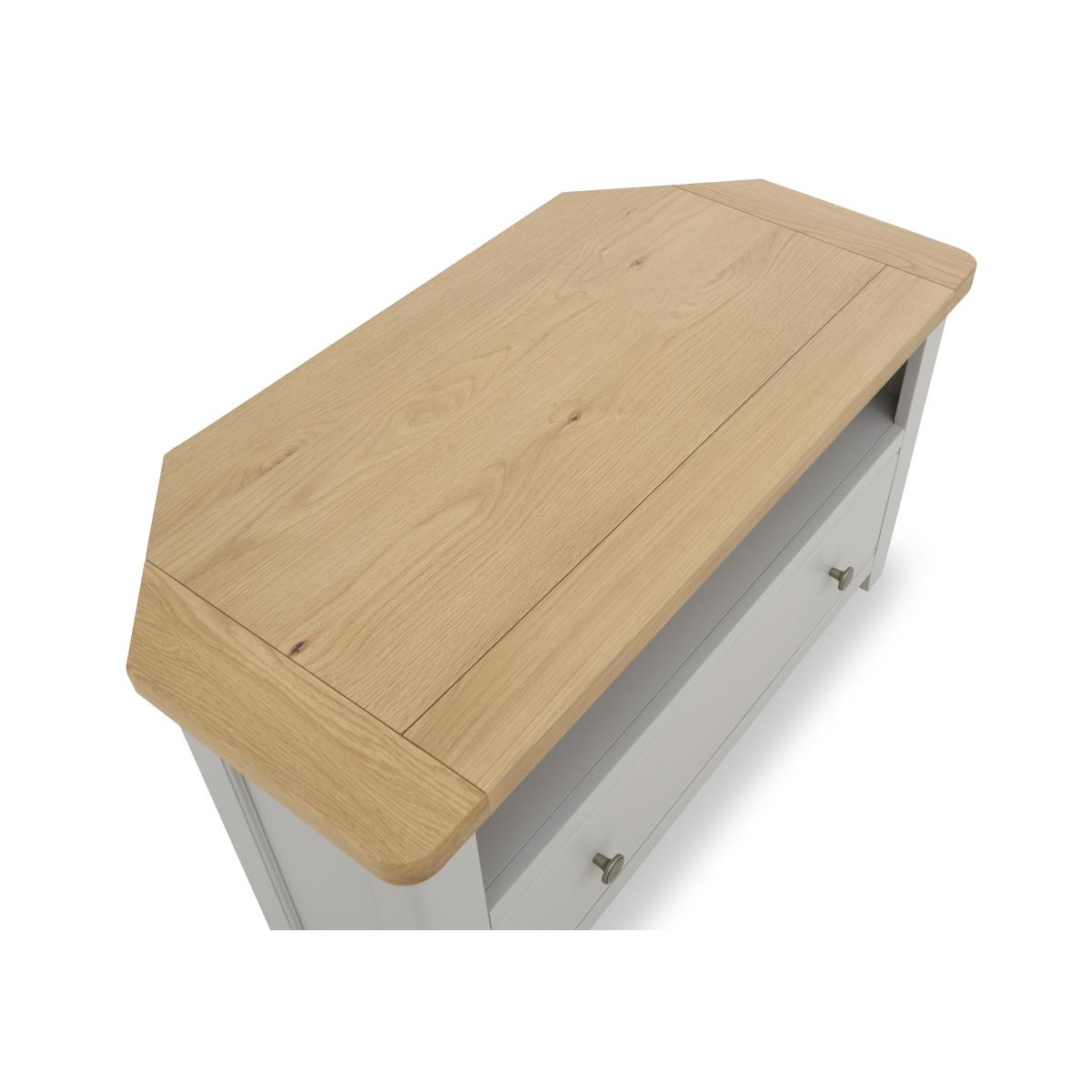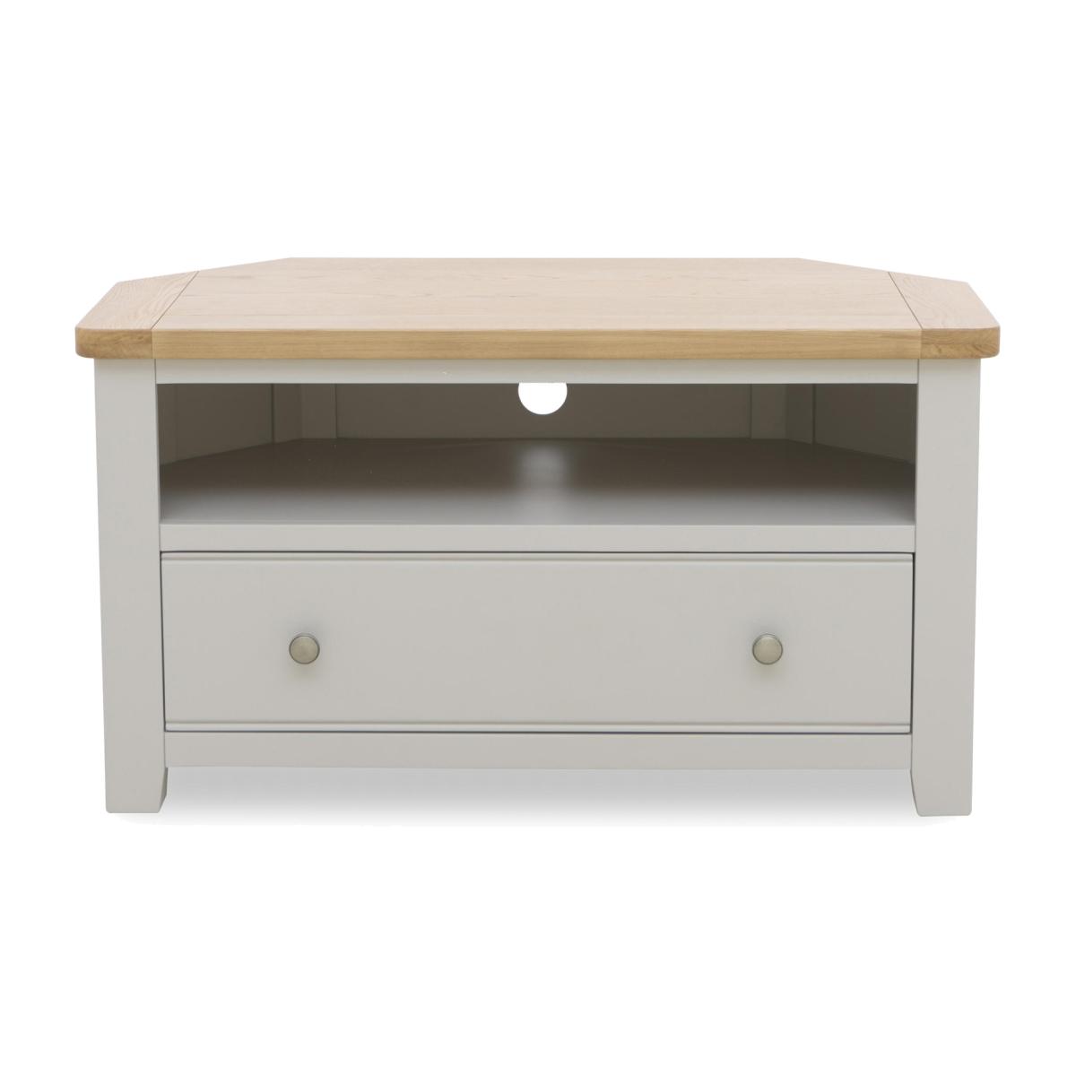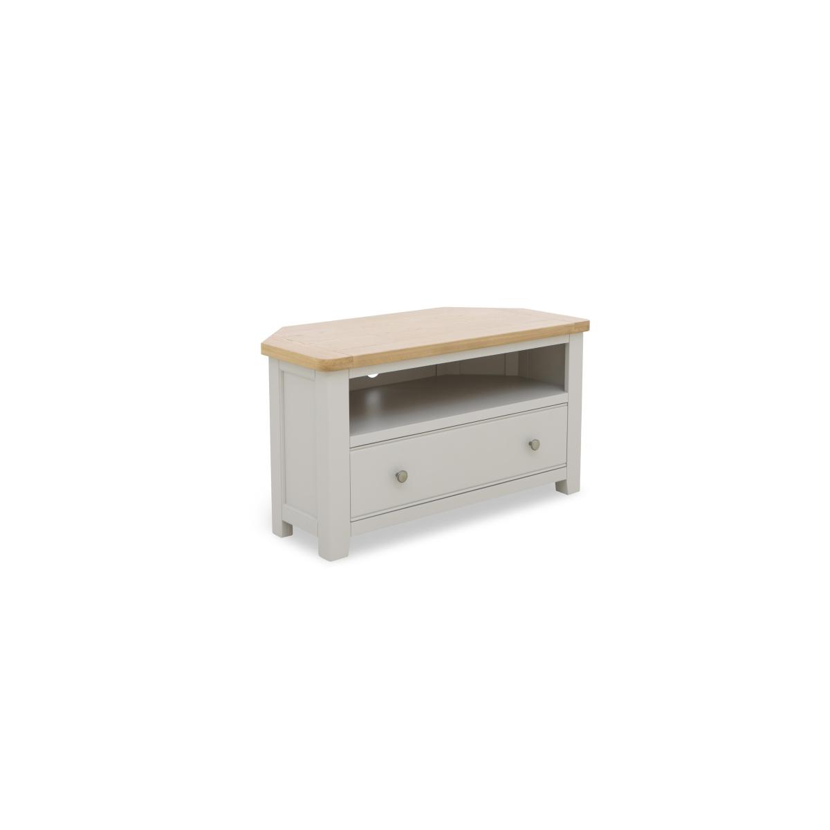With its natural oak and soft grey painted finish, our expertly crafted Lewis corner TV unit delivers charm, style and family-friendly durability alongside truly exceptional value. Why you'll love it Lovely painted wood and oak furniture at an exceptional price. Soft grey finish is perfect for your modern country, Scandi style or coastal chic home. This compact corner TV unit is expertly crafted from oak, oak veneer and pine. The frame is painted twice for a beautiful and hardwearing finish. A clear lacquer protects and enhances the oak top. Timeless design with chunky lines and substantial proportions. 1 drawer with metal drawer pulls. Rear aperture for cable management and ventilation. Only at Furniture Village. This corner TV unit is part of our Furnitureland Lewis range. What you need to know Made with oak and pine. No two pieces of wood or veneer are the same. Variations in colour will occur. Avoid placing in direct sunlight or close to a heat source. We recommend using coasters and placemats at all times. Wipe clean with a damp cloth and then dry using a soft duster. Spills should be wiped immediately and the surface dried. Do not use silicon-based furniture polish or abrasive cleaners. Item code: LWISCTVU--001