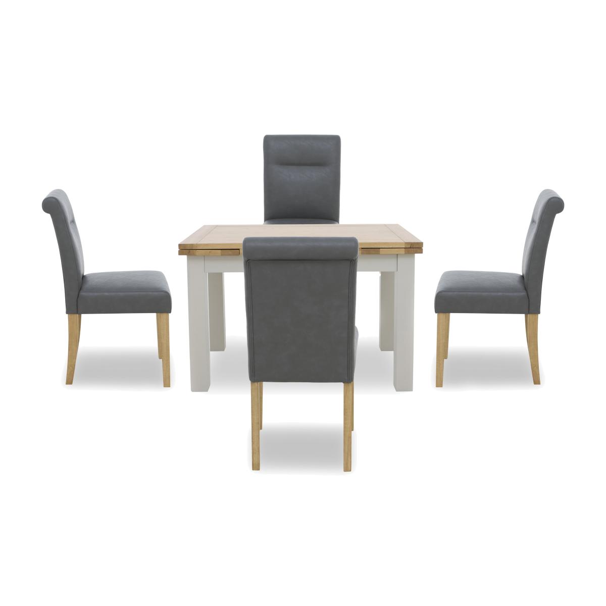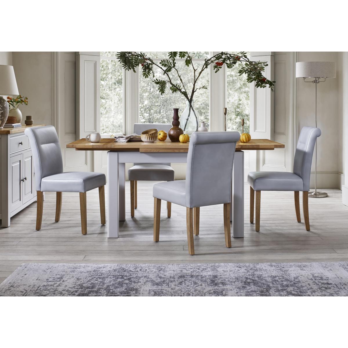 With its natural oak and soft grey painted finish, our expertly crafted Lewis draw leaf extending dining table and four roll back dining chairs set delivers charm, style and family-friendly durability alongside truly exceptional value. Why you'll love it Lovely painted wood and oak furniture at an exceptional price. Soft grey finish is perfect for your modern country, Scandi style or coastal chic home. The draw leaf extending dining table in this dining set is expertly crafted in oak and oak veneer. The apron and legs are painted twice for a beautiful and hardwearing finish. A clear lacquer protects and enhances the oak top. Timeless design with chunky lines and substantial proportions. Easily extends to seat 8. 2 extra leaves are hidden in the table ends. Dining set includes 4 faux leather roll back dining chairs. High rolled backs with an elegant buttoned finish in a choice of colours. Only at Furniture Village. This dining set is part of our Furnitureland Lewis range. What you need to know Dining chairs are made from rubber wood and are cushioned with foam. Dining table is made from oak and oak veneer. This 120 cm draw leaf dining table seats 6 closed and extends to 180 cm to seat 8. No two pieces of wood or veneer are the same. Variations in colour will occur. Avoid placing in direct sunlight or close to a heat source. We recommend using coasters and placemats at all times. Wipe clean with a damp cloth and then dry using a soft duster. Spills should be wiped immediately and the surface dried. Do not use silicon-based furniture polish or abrasive cleaners. Item code: LWISDS11DGRY-001
