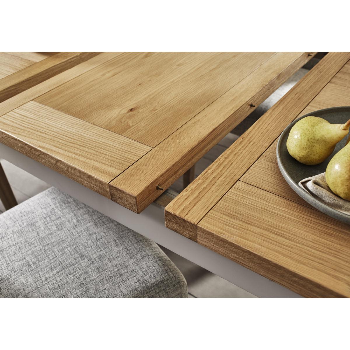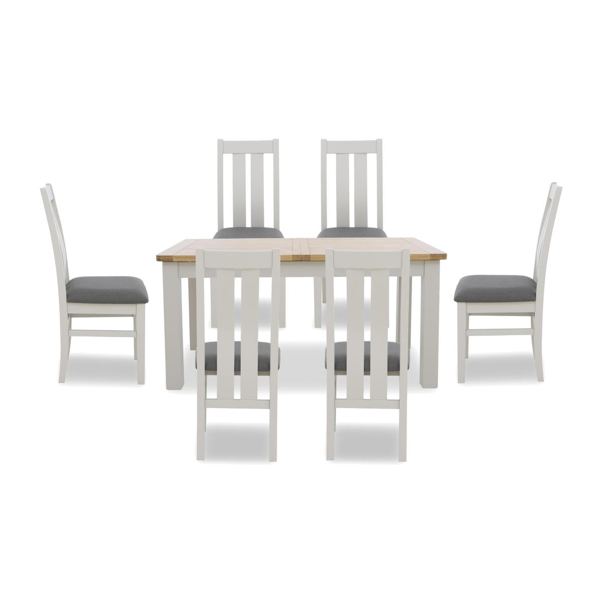With its natural oak and soft grey painted finish, our expertly crafted Lewis extending dining table and six slatted dining chairs set delivers charm, style and family-friendly durability alongside truly exceptional value. Why you'll love it Lovely painted wood and oak furniture at an exceptional price. Soft grey finish is perfect for your modern country, Scandi style or coastal chic home. The extending dining table in this dining set is expertly crafted in oak and oak veneer. The apron and legs are painted twice for a beautiful and hardwearing finish. A clear lacquer protects and enhances the oak top. Timeless design with chunky lines and substantial proportions. Easily extends to seat 8. Dining set includes 6 expertly crafted wooden slatted back dining chairs. Contemporary, gently curved chair backs. In a choice of upholstery colours for the cushioned seats. Only at Furniture Village. This dining set is part of our Furnitureland Lewis range. What you need to know Dining chairs are made from pine and are cushioned with foam. Dining table is made from oak and oak veneer. 160 cm dining table seats 6 closed and extends to 200 cm to seat 8. No two pieces of wood or veneer are the same. Variations in colour will occur. Avoid placing in direct sunlight or close to a heat source. We recommend using coasters and placemats at all times. Wipe clean with a damp cloth and then dry using a soft duster. Spills should be wiped immediately and the surface dried. Do not use silicon-based furniture polish or abrasive cleaners. Item code: LWISDS3-ANTH-001