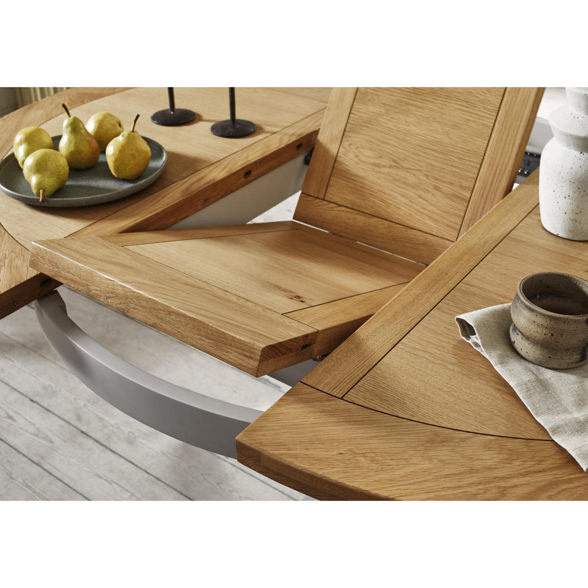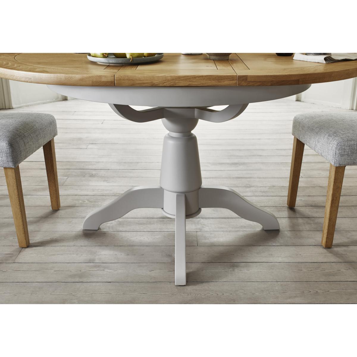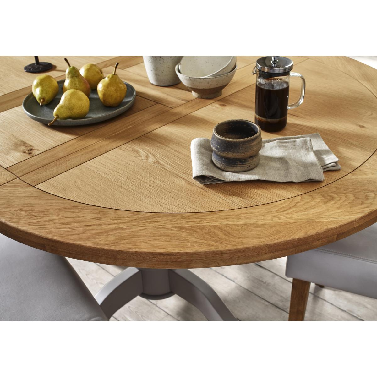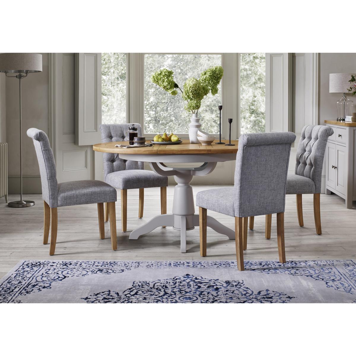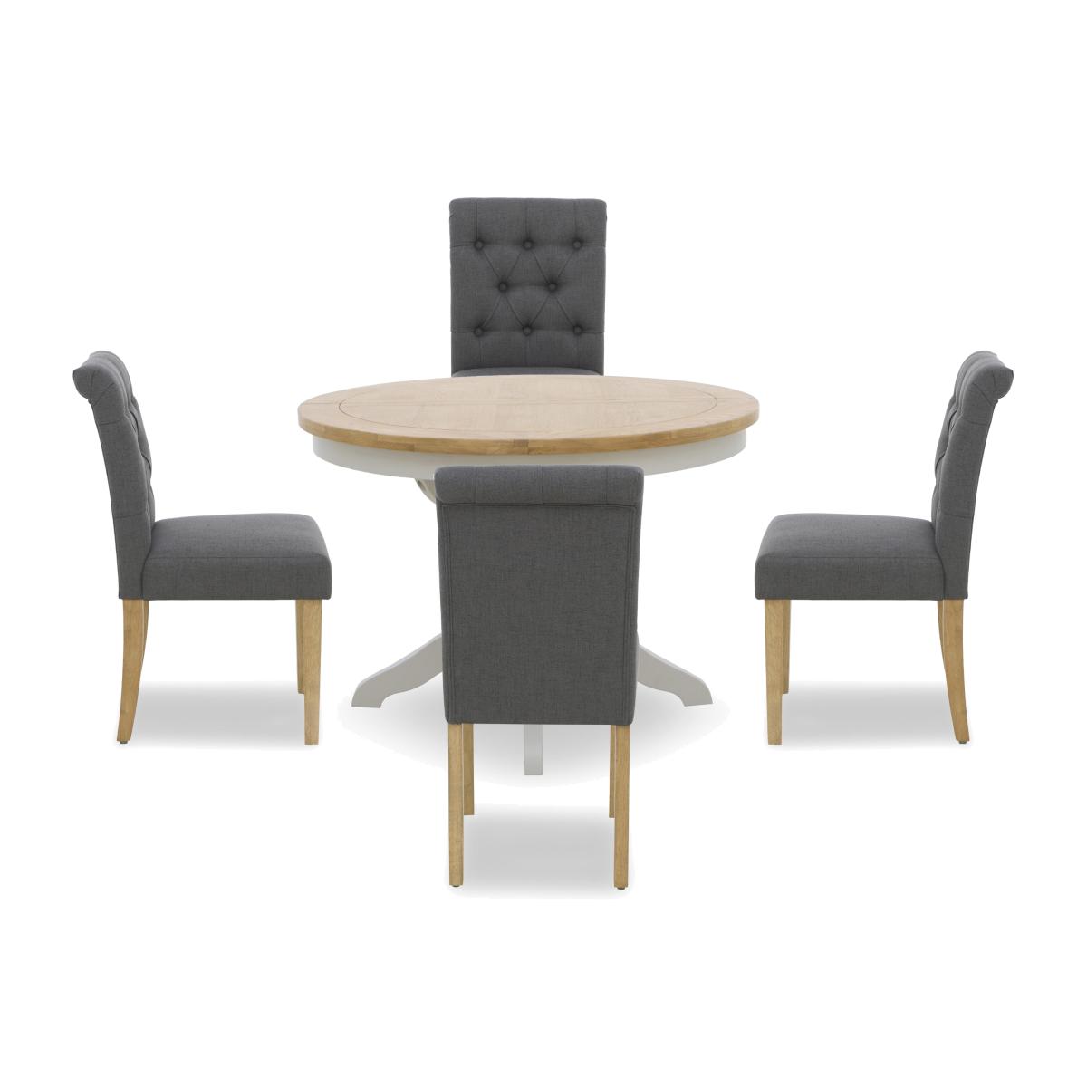 With its natural oak and soft grey painted finish, our expertly crafted Lewis round extending dining table and four button back dining chairs set delivers charm, style and family-friendly durability alongside truly exceptional value. Why you'll love it Lovely painted wood and oak furniture at an exceptional price. Soft grey finish is perfect for your modern country, Scandi style or coastal chic home. This round extending dining table is expertly crafted in oak and oak veneer. The apron and pedestal base are painted twice for a beautiful and hardwearing finish. A clear lacquer protects and enhances the oak top. Timeless design with chunky lines and substantial proportions. Easily extends to seat 6 with a butterfly extension mechanism. Dining set includes 4 expertly crafted button back dining chairs. Timeless design with high cushioned backs and buttoning. In a choice of upholstery fabrics. Only at Furniture Village. This dining set is part of our Furnitureland Lewis range. What you need to know Dining chairs are made from rubber wood and are cushioned with foam. Dining table is made from oak and oak veneer. This round dining table seats 4 closed and extends to seat 6. No two pieces of wood or veneer are the same. Variations in colour will occur. Avoid placing in direct sunlight or close to a heat source. We recommend using coasters and placemats at all times. Wipe clean with a damp cloth and then dry using a soft duster. Do not use silicon-based furniture polish or abrasive cleaners. Item code: LWISDS10ANTH-001