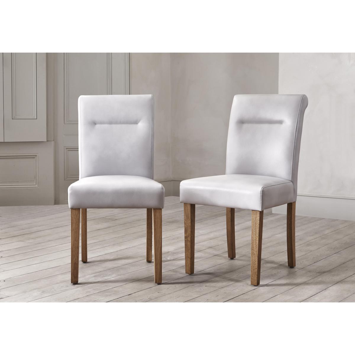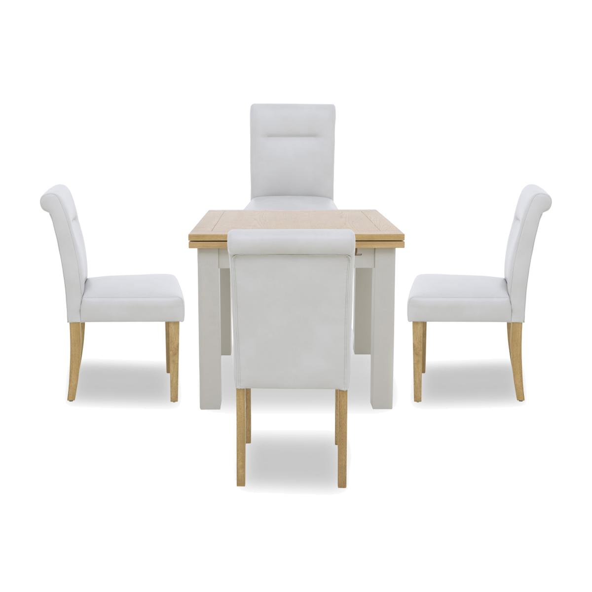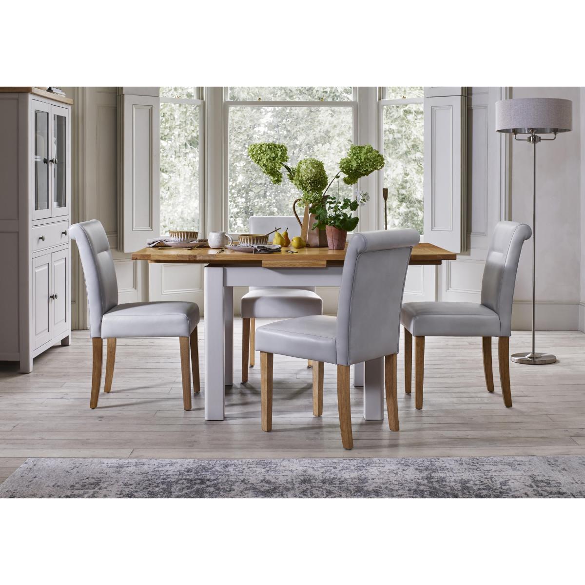 With its natural oak and soft grey painted finish, our expertly crafted Lewis draw leaf extending dining table and four roll back dining chairs set delivers charm, style and family-friendly durability alongside truly exceptional value. Why you'll love it Lovely painted wood and oak furniture at an exceptional price. Soft grey finish is perfect for your modern country, Scandi style or coastal chic home. The draw leaf extending dining table in this dining set is expertly crafted in oak and oak veneer. The apron and legs are painted twice for a beautiful and hardwearing finish. A clear lacquer protects and enhances the oak top. Timeless design with chunky lines and substantial proportions. Easily extends to seat 6. 2 extra leaves are hidden in the table ends. Dining set includes 4 faux leather roll back dining chairs. High rolled backs with an elegant buttoned finish in a choice of colours. Only at Furniture Village. This dining set is part of our Furnitureland Lewis range. What you need to know Dining chairs are made from rubber wood and are cushioned with foam. Dining table is made from oak and oak veneer. This 90 cm draw leaf dining table seats 4 closed and extends to 150 cm to seat 8. No two pieces of wood or veneer are the same. Variations in colour will occur. Avoid placing in direct sunlight or close to a heat source. We recommend using coasters and placemats at all times. Wipe clean with a damp cloth and then dry using a soft duster. Spills should be wiped immediately and the surface dried. Do not use silicon-based furniture polish or abrasive cleaners. Item code: LWISDS13LGRY-001