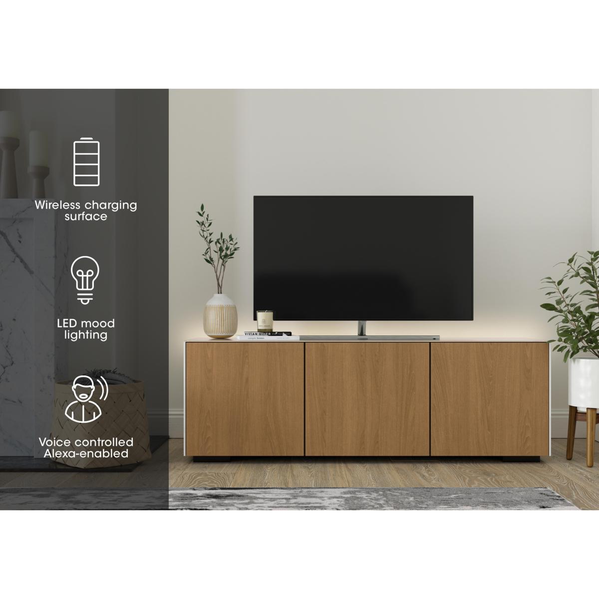 The modern Lexa range is packed with smart features such as voice controlled mood lighting, hidden wireless phone charging and Intelligent Eye technology. Yet you’d never guess, all you see is the clean, contemporary lines. Discover ultra-modern TV and media units, occasional tables and storage in a choice of glossy black, white or grey, with the option of walnut or oak finish doors. Create the perfect ambience for any occasion with LED mood lighting controlled via Alexa or a free Smartphone App. This wide TV unit accommodates a 70” TV. It’s smart, too, with voice controlled LED lighting and wireless phone charging. Ultra-modern style, in a wide choice of finishes. PLEASE NOTE: This is a self-assembly item. Why you'll love it. High tech, ultra-modern wide TV unit. Charge your phone wirelessly on the glass top. Stunning LED rear mood lighting. Voice controlled, or by smartphone App. Create any colour, brightness and ambience. Intelligent eye technology, remotes work with doors closed. Part of the smart Lexa range. What you need to know. Suits a screen of up to 70”. 3 cupboards, each with 1 adjustable shelf. Solid 18mm board. In a black, grey or white high gloss finish. With the option of walnut or oak effect doors. Hairline marks are a natural feature of high gloss finishes. Tempered glass top. Painted, foil wrapped doors have magnetic catches. Passive built-in air flow ventilation. Spaces for rear cabling. 12 month manufacturer warranty. Up to 6 pieces of AV equipment can be operated by standard remote controls with doors closed. LED rear mood lighting in the full colour spectrum, controlled by the free Frank Olsen Smart app or voice command with Amazon Alexa. With pre-set features. Lighting can be set remotely over Wi Fi to switch on or off at required times.