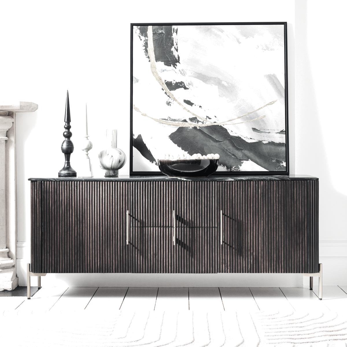 Contemporary with a traditional touch, the stunning Lexi 2 Door 2 Drawer Sideboard oozes a sophisticated charm. Carefully crafted with dark mango wood, it’s complete with vertical striped detailing and gold minimalistic handles and feet for a statement modern finish. Featuring 2 doors with shelving inside and 2 spacious drawers, its practicality is endless, providing you with all your storage needs.