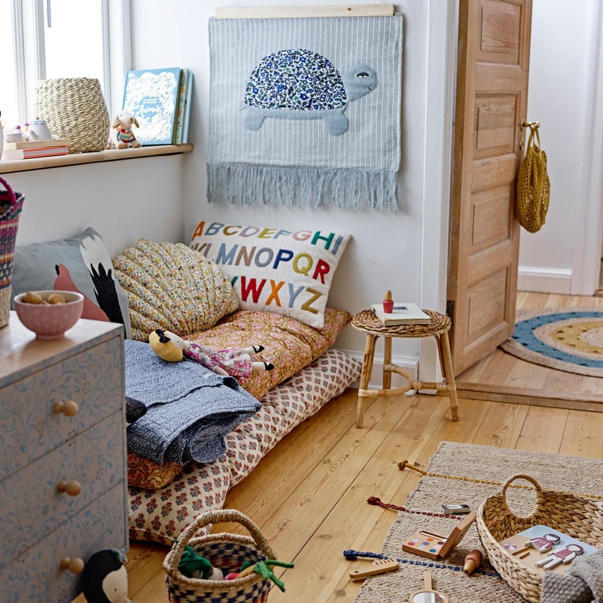 The Lexi cushion from Danish company Bloomingville has a multi-coloured letters of the alphabet pattern. The cushion cover is made of cotton and the soft inner cushion makes it a comfortable cushion to sit on in the playroom. The cushion also makes a lovely and educational addition to the bed.