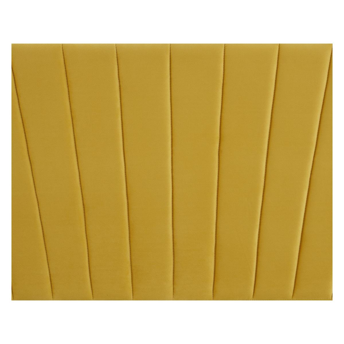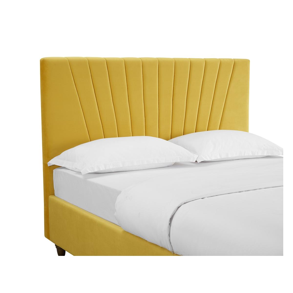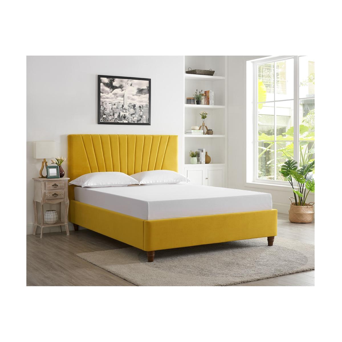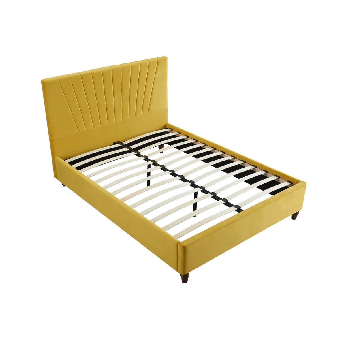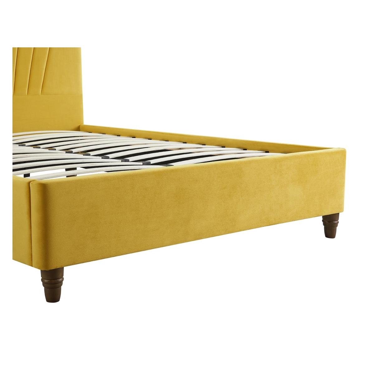 Dimensions W162cm x D217cm x H123.5cm Features. Upholstered in Mustard Velvet the Lexie is all about the instant vintage feel it gives once installed into your bedroom.The Lexie has an antique vibe about it but with a modern twist. The detailed headboard is embraced with the modern mustard yellow colour so it is ready to make your home and interior feel contemporary. The Lexie stands on wooden effect legs with copper accents on which adds extra detail and emphasises the antique feel of the bed. Assembly Required..