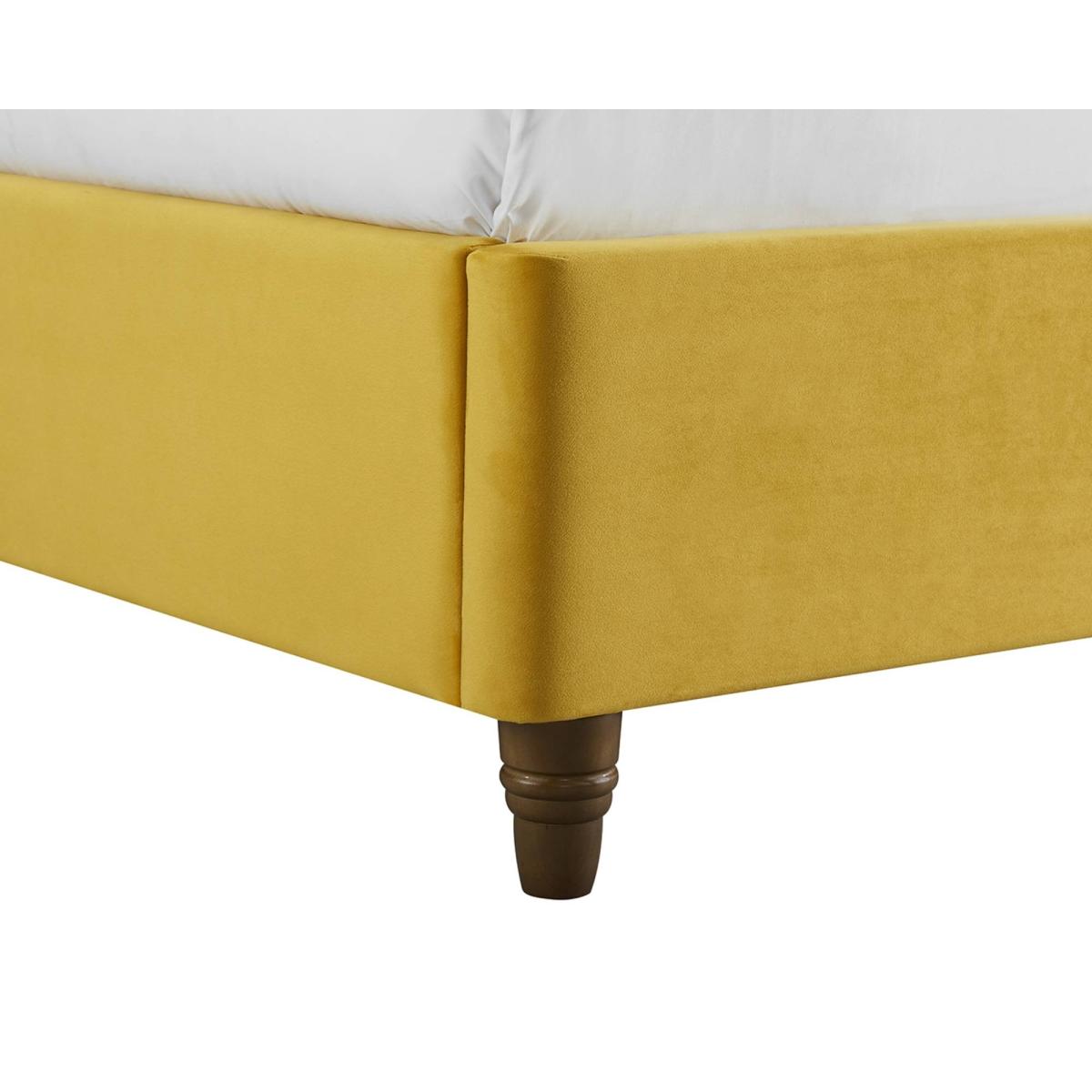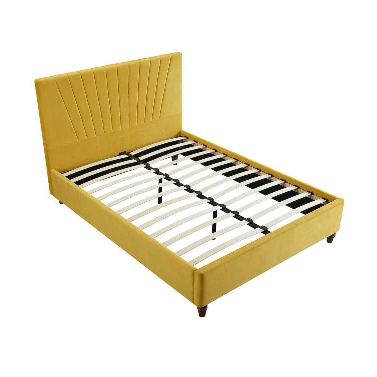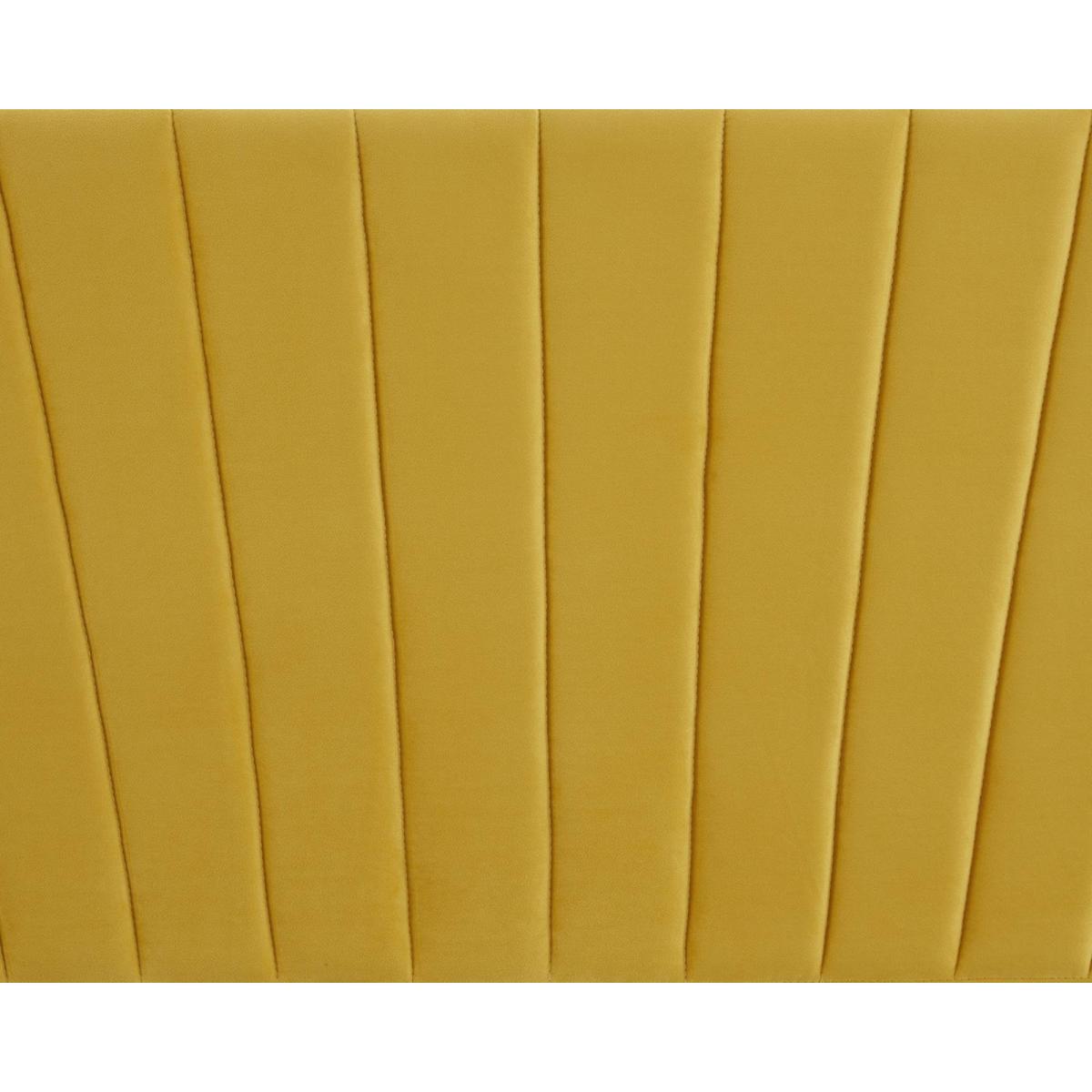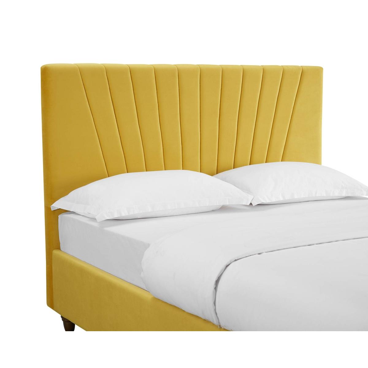A vintage and stylish feature in the bedroom. The Lexie Kingsize Bed in mustard is a luxurious statement piece for the bedroom. Stylish with an antique vibe, this unique and stand out bed boasts a bold and bright yellow upholstered fabric throughout. The stitch detail headboard brings a touch of retro for a glorious nights sleep. Sink into a cosy state of mind in this dreamy bed.