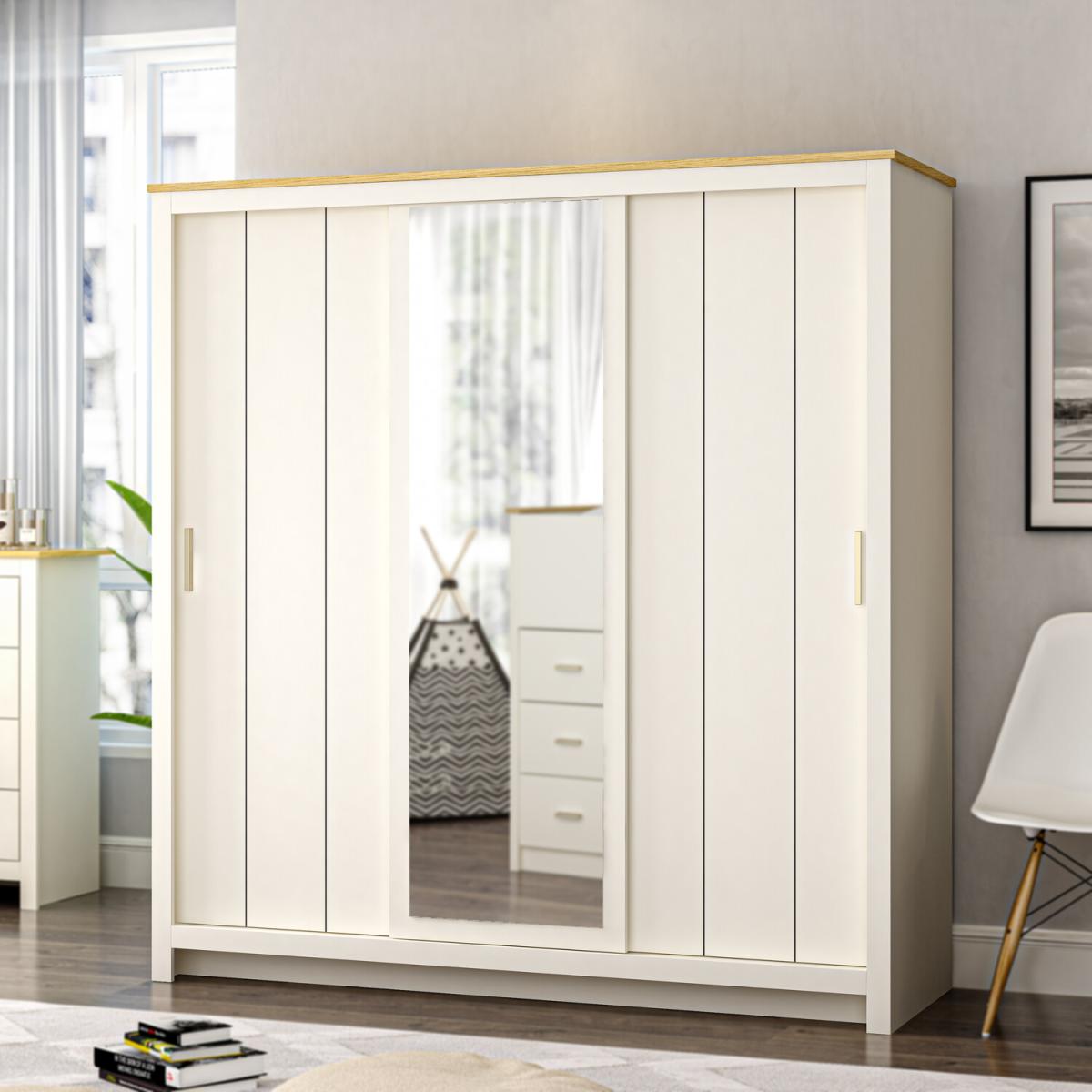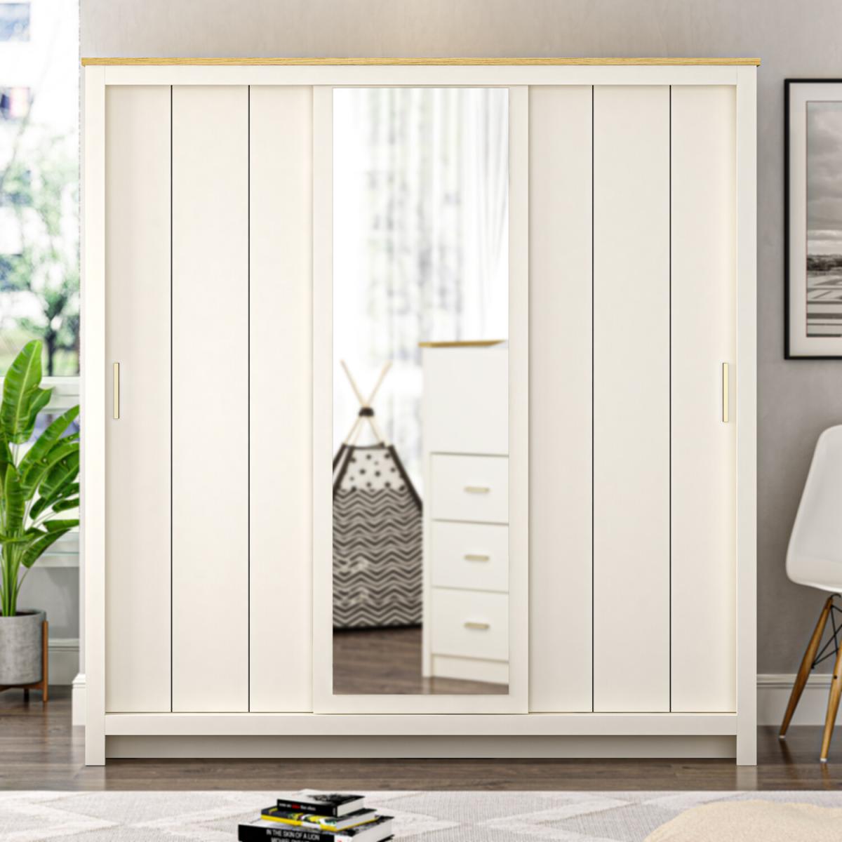 I’m a fan of this cream-and-gold sliding wardrobe for its clean lines and central mirror door - it instantly brightens a room and saves space with its pocket-style tracks. It sits well in contemporary Scandi or soft-glam schemes, pairing easily with pale woods, warm metals and minimal accessories. Styling tip: position it opposite a window to amplify daylight, then keep the surrounding décor simple - think a neutral rug, matching bedside lamps and a couple of woven baskets on top for extra storage. Inside, use slimline hangers and a mix of drawers or fabric boxes to make the most of the three-door layout.