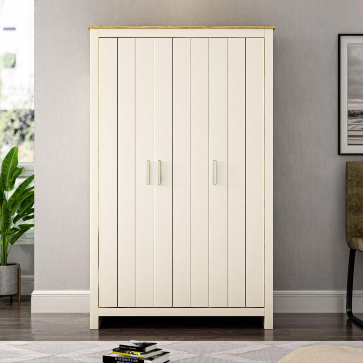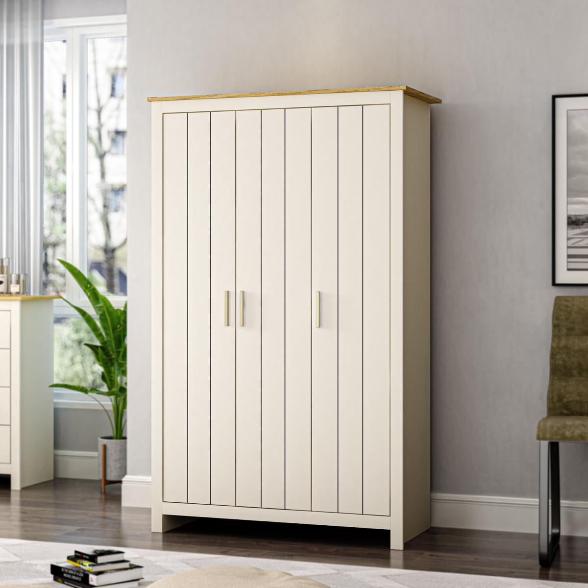 I love the clean lines and subtle gold trim on this three-door wardrobe - the soft cream finish works as well in a Scandi-inspired bedroom as it does in a more traditional scheme, and the metallic highlight adds a touch of mid-century flair. It’s equally at home in a main bedroom or a dedicated dressing space, especially when paired with muted jewel tones or pastel accents. For a streamlined look, keep the top clear or style it with matching baskets, then use uniform hangers and labelled boxes on the adjustable shelves inside. Place a brass-framed mirror nearby, add a textured rug underfoot and a simple floor lamp to complete the space.