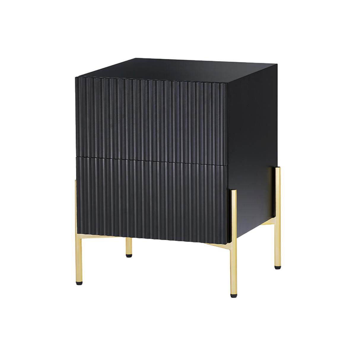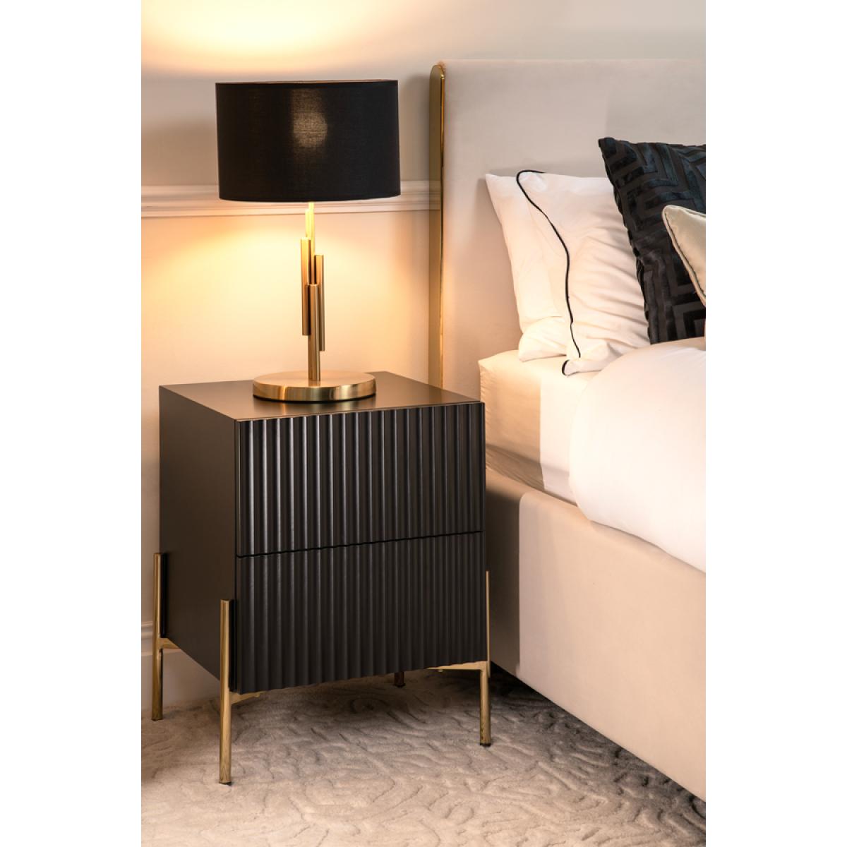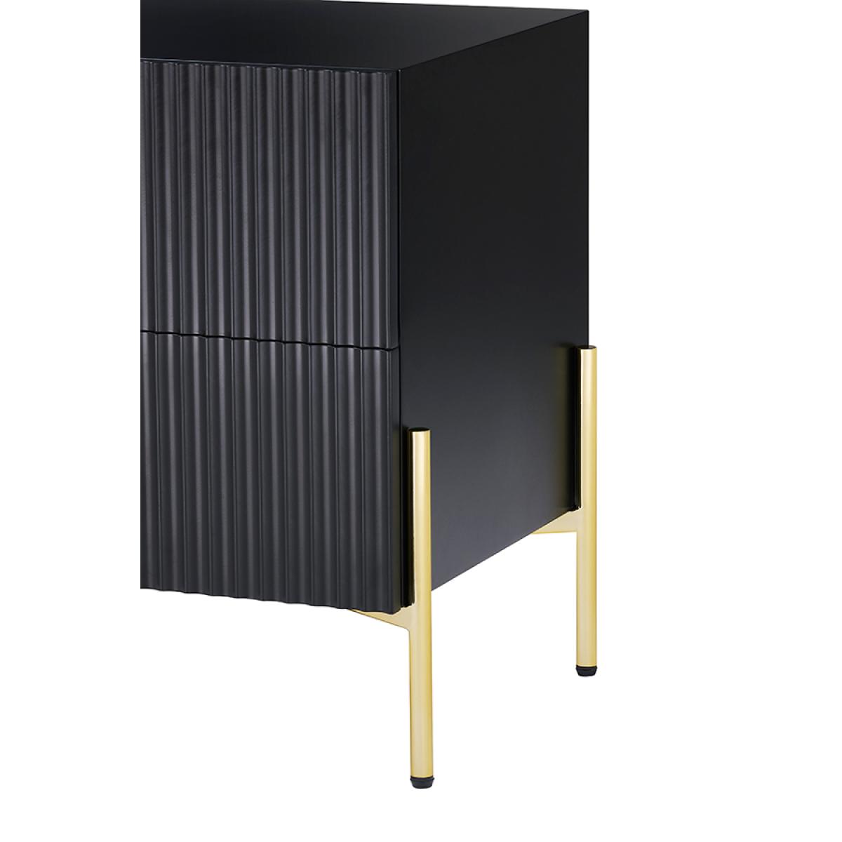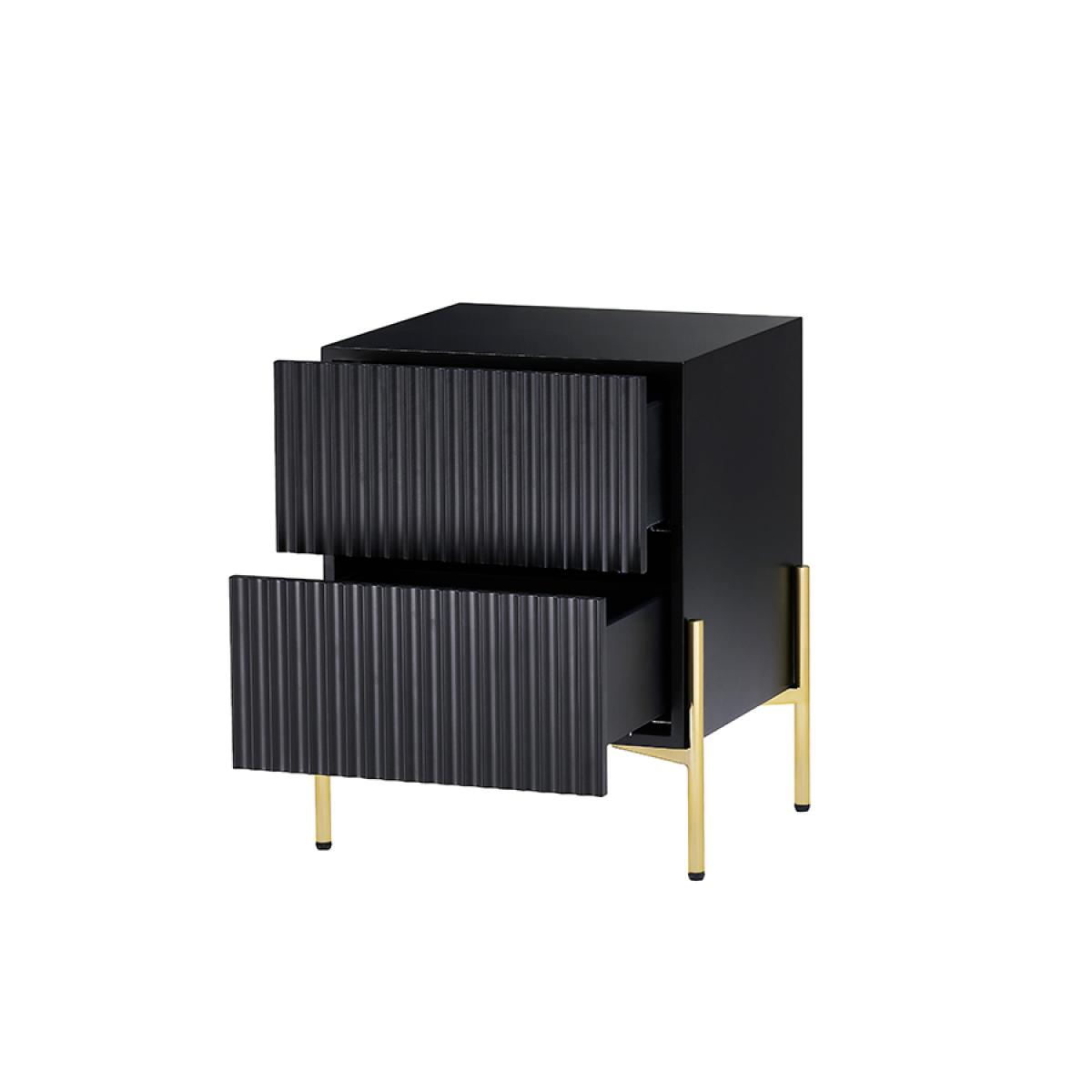A chic, contemporary bedside table with reeded detailing to drawer fronts. Push catch drawer closures - push in the centre of the drawers to open or close. Durable black polyurethane paint finish. Brushed stainless steel legs with brass finish. Simple assembly required.