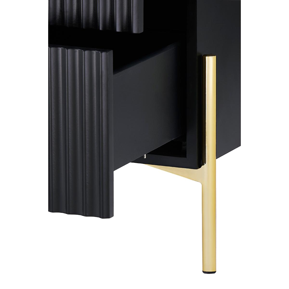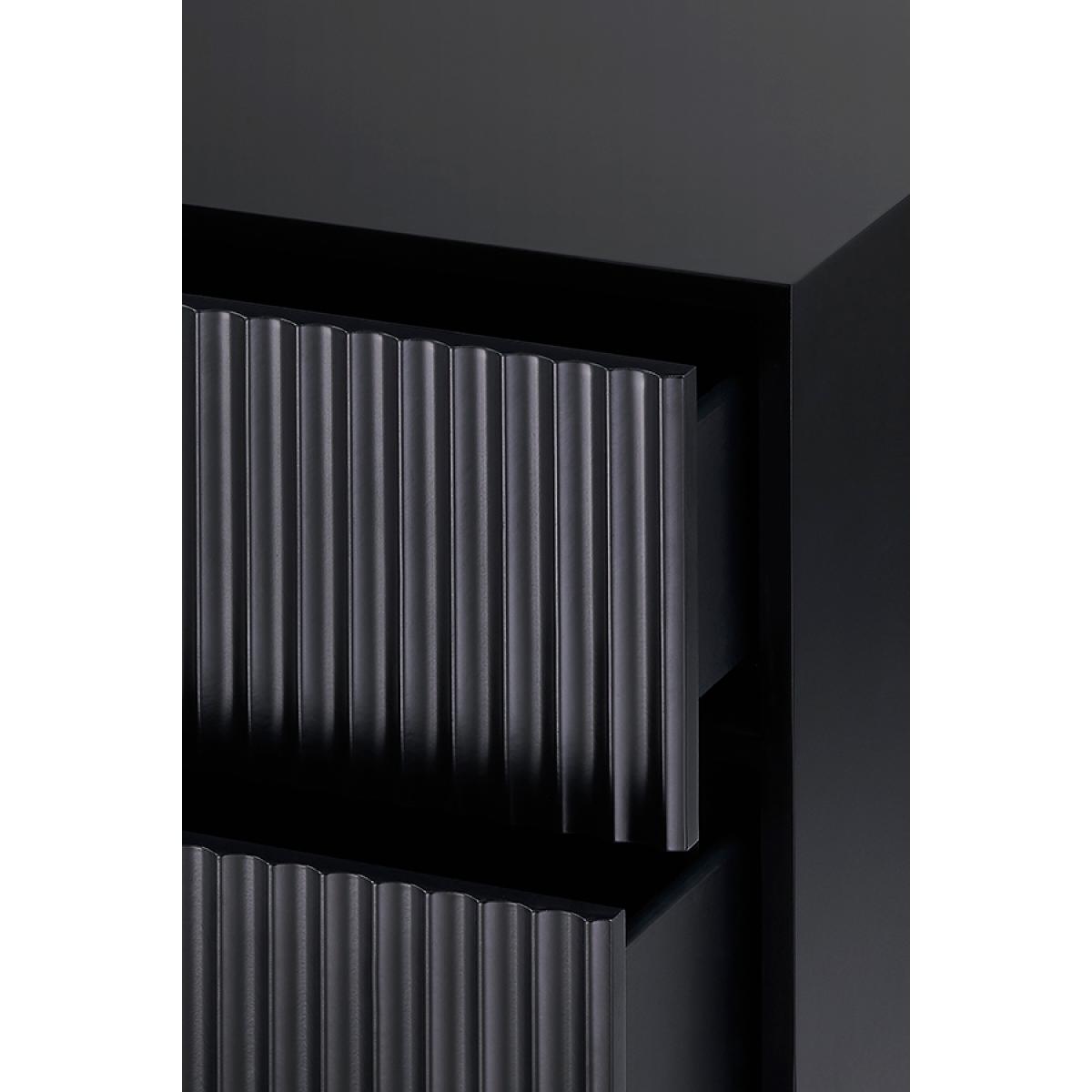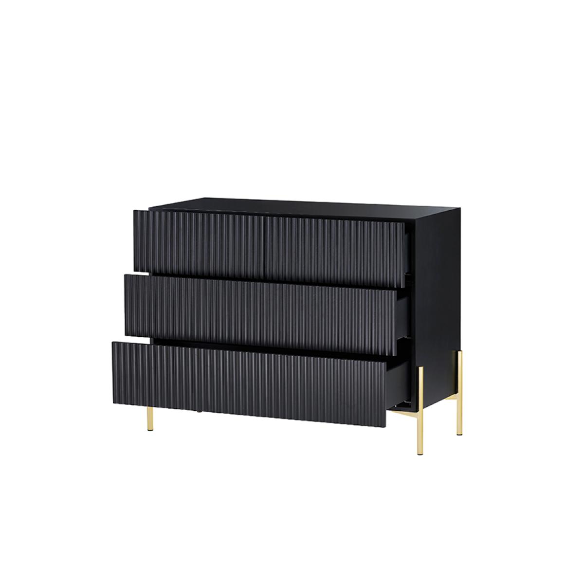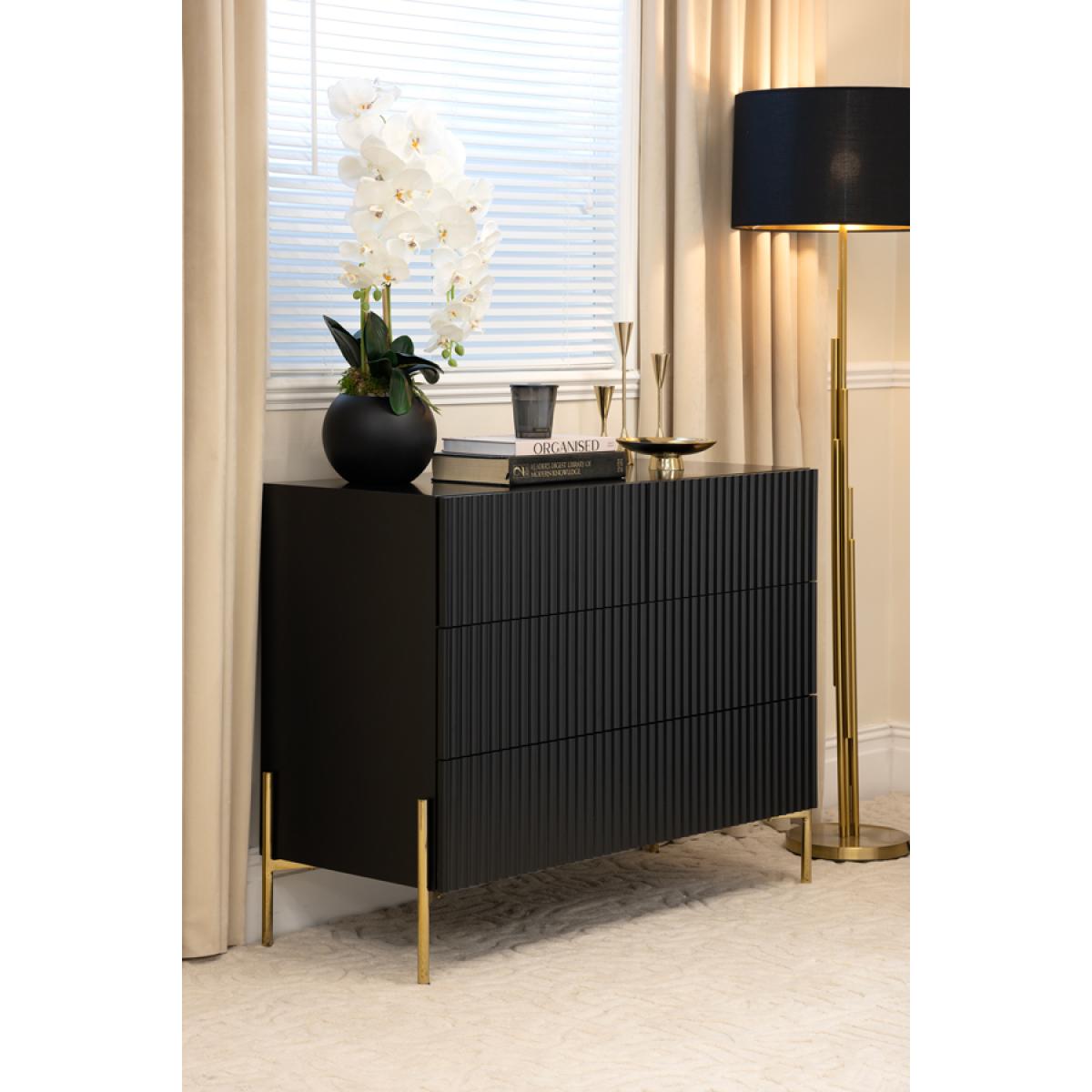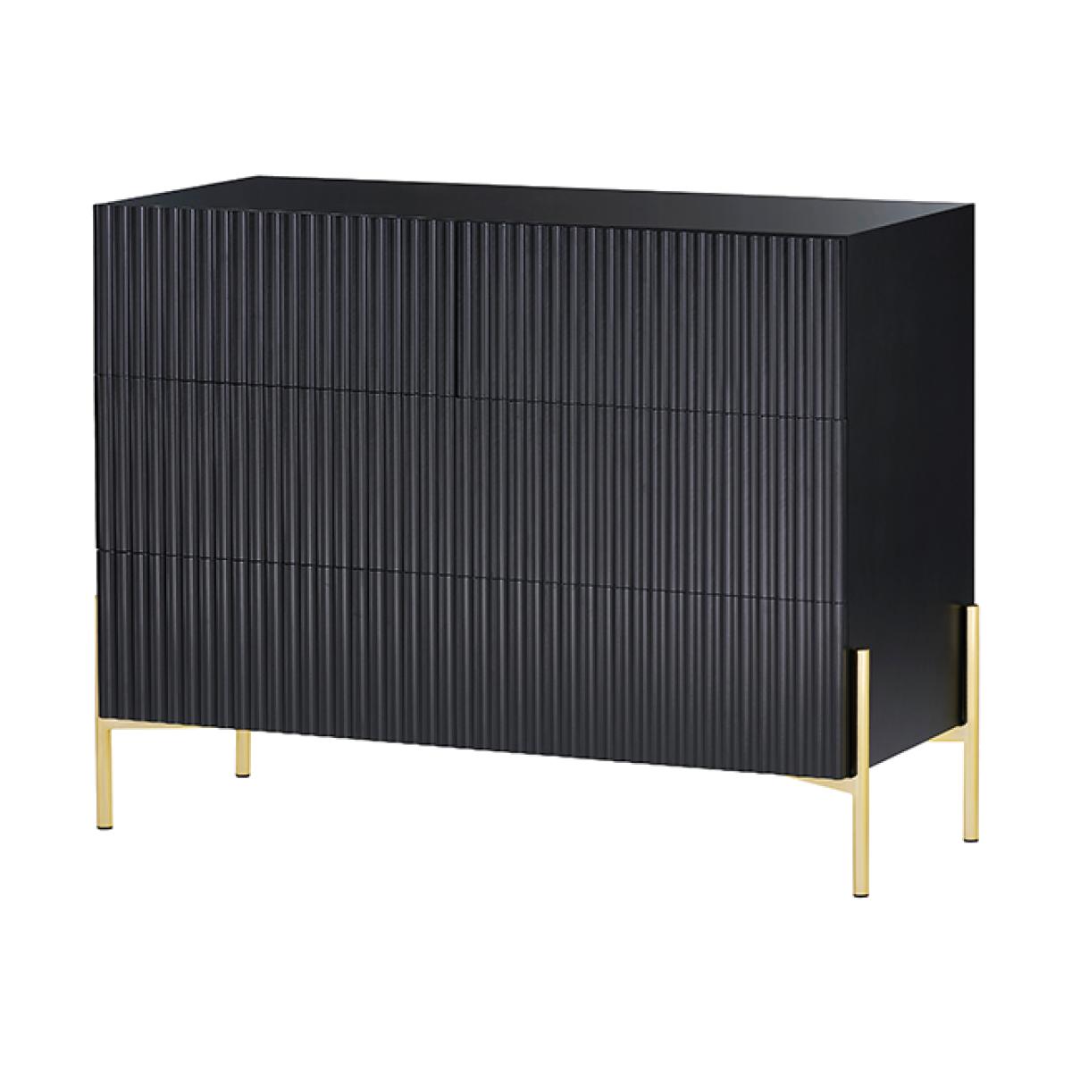 A chic, contemporary chest of drawers with reeded detailing to drawer fronts. Push catch drawer closures – push in the centre of the drawers to open or close. Durable black polyurethane paint finish. Brushed stainless steel legs with brass finish. Simple assembly required.