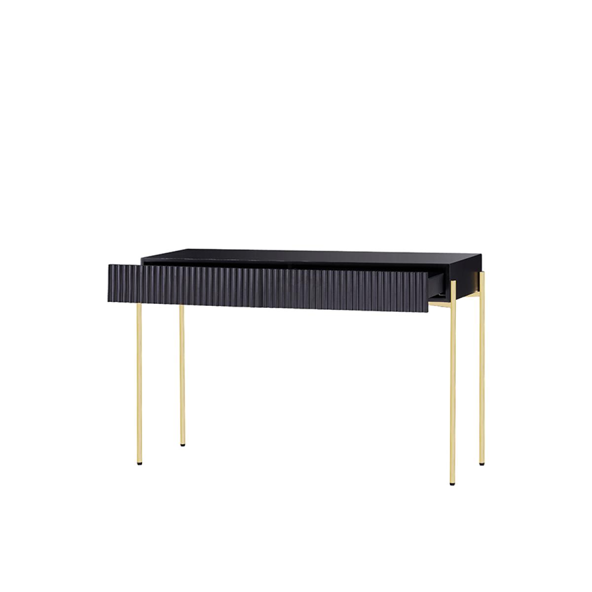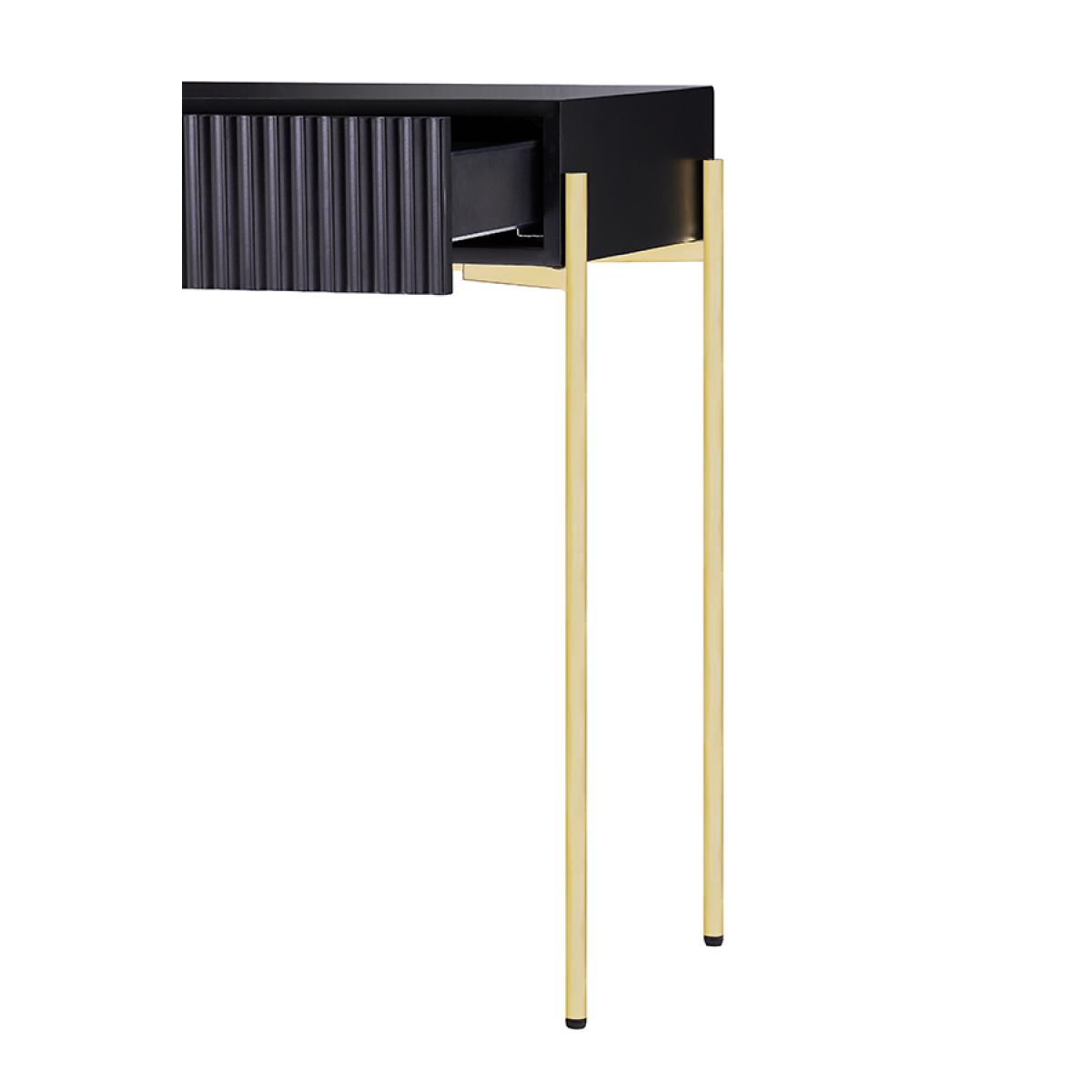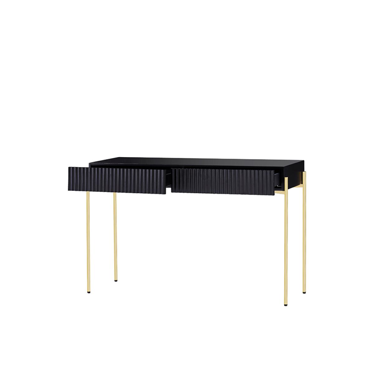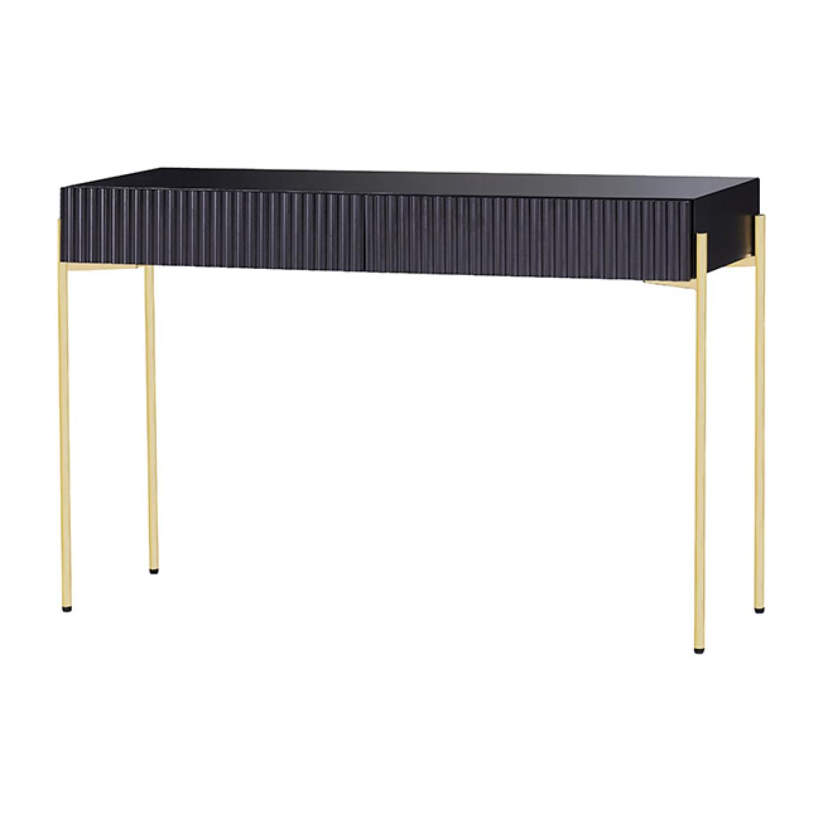 A chic, contemporary console table with reeded detailing to drawer fronts. Push catch drawer closures – push in the centre of the drawers to open or close. Durable black polyurethane paint finish. Brushed stainless steel legs with brass finish. Simple assembly required.