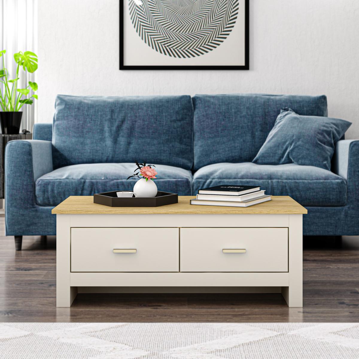 Perfect for any living area, the Lexington Coffee Table is designed to help keep all your electronics, everyday essentials, and scrumptious snacks stored with ease. Boasting a charming two-toned design in soft and neutral colours, this coffee table even features two handy storage drawers to the front. With an oak-effect table top, this elegant and stylish coffee table is sure to complement any home environment.