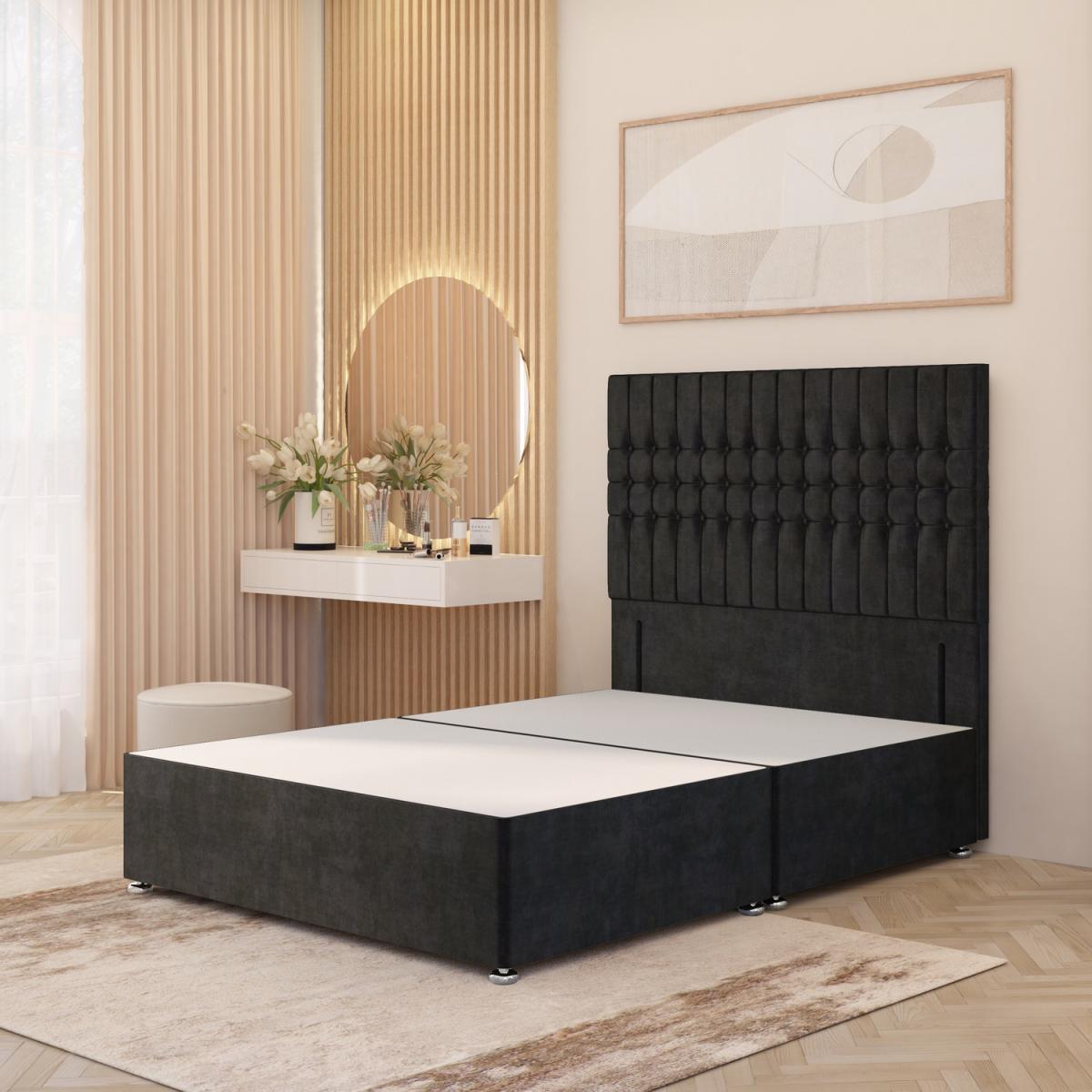 The Lexington Plush Velvet Divan Bed Base with Floor Standing Upholstered Headboard combines timeless luxury with sustainable British craftsmanship. Ethically made in the UK from responsibly sourced timber, the solid platform top base offers firm, stable orthopaedic support, outperforming standard slatted frames. Upholstered in plush velvet, it brings refined elegance to both classic and modern bedrooms. The 54" tall Lexington headboard (32" front panel) features deep cushioning with premium polyester foam, enhanced by a ripple-effect design, hand-tufted fabric button detailing, and square panelling. A striking centrepiece, it blends grandeur with comfort for everyday use. The divan base measures 34.5cm in height with gliders attached (30.5cm without) and comes in all standard UK sizes 2FT. 6 Small Single, 3FT Single, 4FT Small Double, 4FT. 6 Double, 5FT King, and 6FT Super King. Choose from practical storage options including no drawers, 2 drawers (same side), or 4 drawers, for a bed that is as functional as it is luxurious.