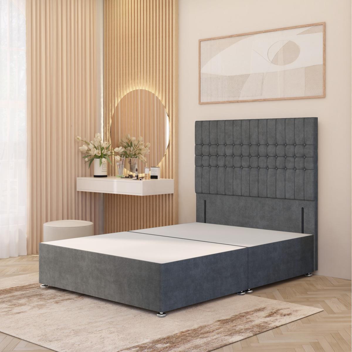 The Lexington Plush Velvet Divan Bed Base with Floor Standing Upholstered Headboard combines timeless luxury with sustainable British craftsmanship. Ethically made in the UK from responsibly sourced timber, the solid platform top base offers firm, stable orthopaedic support, outperforming standard slatted frames. Upholstered in plush velvet, it brings refined elegance to both classic and modern bedrooms. The 54" tall Lexington headboard (32" front panel) features deep cushioning with premium polyester foam, enhanced by a ripple-effect design, hand-tufted fabric button detailing, and square panelling. A striking centrepiece, it blends grandeur with comfort for everyday use. The divan base measures 34.5cm in height with gliders attached (30.5cm without) and comes in all standard UK sizes 2FT. 6 Small Single, 3FT Single, 4FT Small Double, 4FT. 6 Double, 5FT King, and 6FT Super King. Choose from practical storage options including no drawers, 2 drawers (same side), or 4 drawers, for a bed that is as functional as it is luxurious.