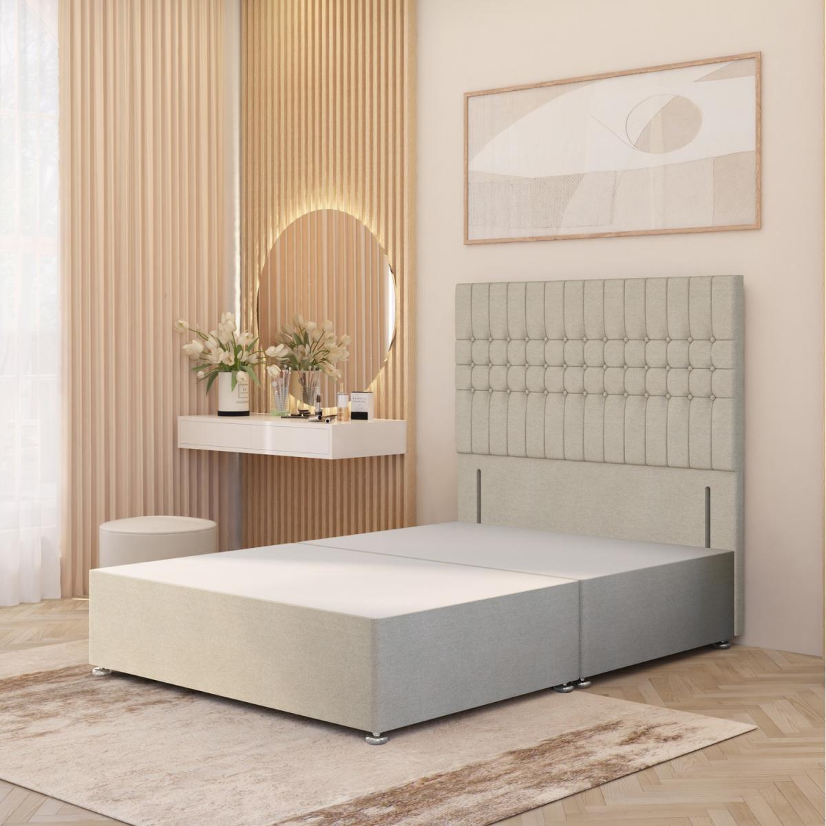 The Lexington Tweed Fabric Divan Bed Base with Floor Standing Upholstered Headboard combines timeless luxury with sustainable British craftsmanship. Ethically made in the UK from responsibly sourced timber, the solid platform top base offers firm, stable orthopaedic support, outperforming standard slatted frames. Upholstered in tweed fabric, it brings texture and refined elegance to both classic and modern bedrooms. The 54" grand Lexington headboard (32" front panel) features deep cushioning with premium polyester foam, enhanced by a ripple-effect design, hand-tufted fabric button detailing, and square panelling. A striking centrepiece, it blends grandeur with comfort for everyday use. The divan base measures 34.5cm in height with gliders attached (30.5cm without) and comes in all standard UK sizes 2FT. 6 Small Single, 3FT Single, 4FT Small Double, 4FT. 6 Double, 5FT King, and 6FT Super King. Choose from practical storage options including no drawers, 2 drawers (same side), or 4 drawers, for a bed that is as functional as it is luxurious.