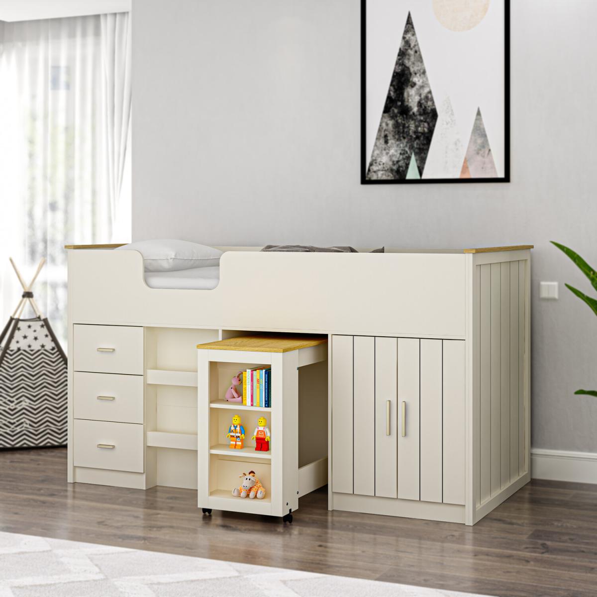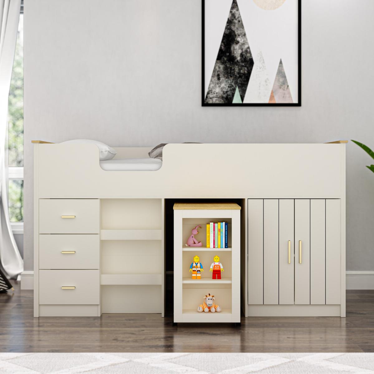 I’m a fan of this cream and gold mid sleeper because it combines a neat, elevated sleeping space with plenty of clever storage - drawers, cupboards and an open trolley for books or toys. It sits well in Scandi-inspired or neutral contemporary bedrooms and can be dressed up with pastel bedding or bolder accent cushions. For styling, tuck a soft rug underneath to define the area, add woven baskets in the open shelves for toys and use coordinating gold-trimmed accessories (a lamp or picture frames) to tie the look together. A slim potted plant beside it brings a touch of greenery without cluttering the footprint.
