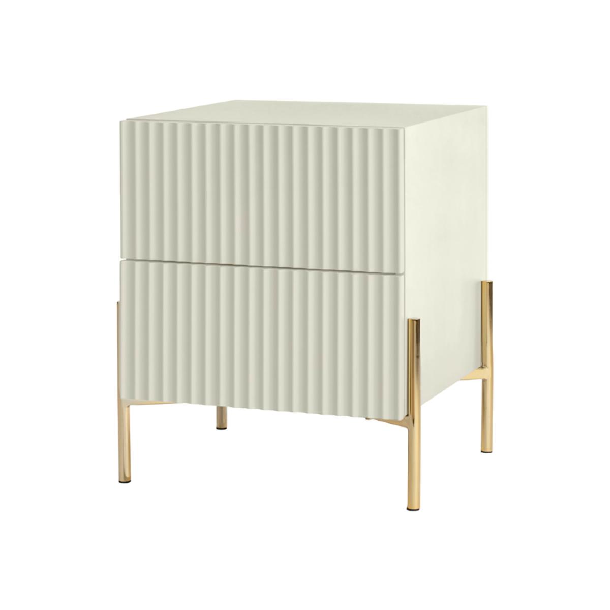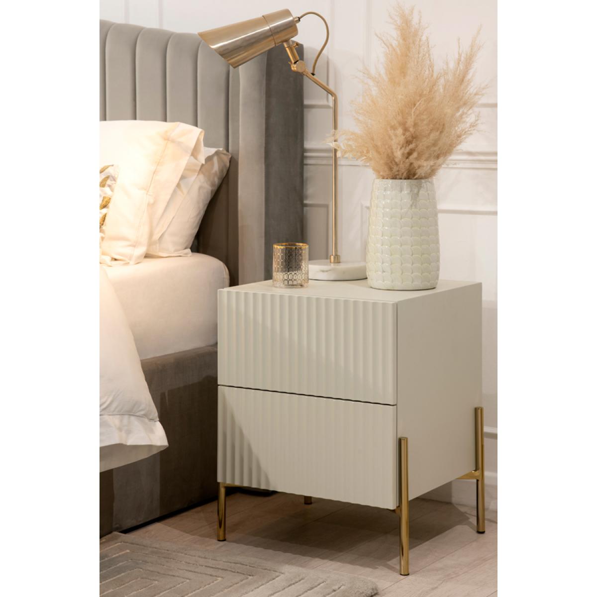 A chic, contemporary bedside table with reeded detailing to drawer fronts. Push catch drawer closures - push in the centre of the drawers to open or close. Durable polyurethane paint finish in a soft pebble grey colour. Brushed stainless steel legs with brass finish. Simple assembly required.
