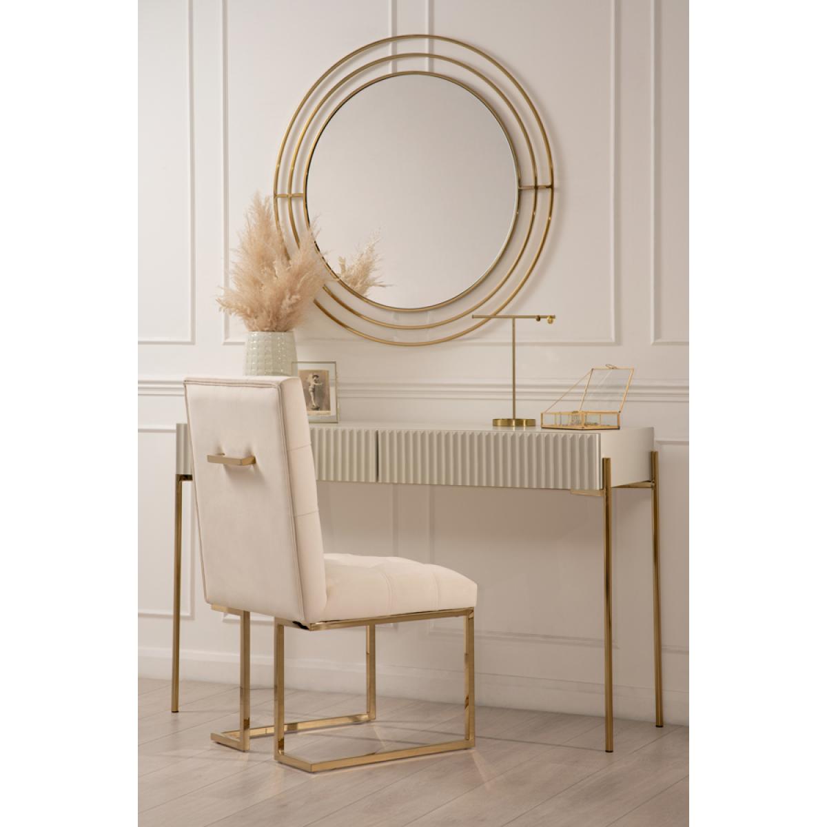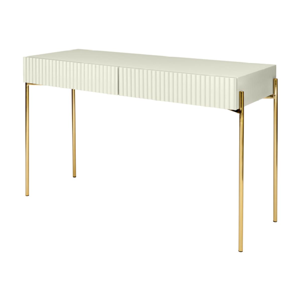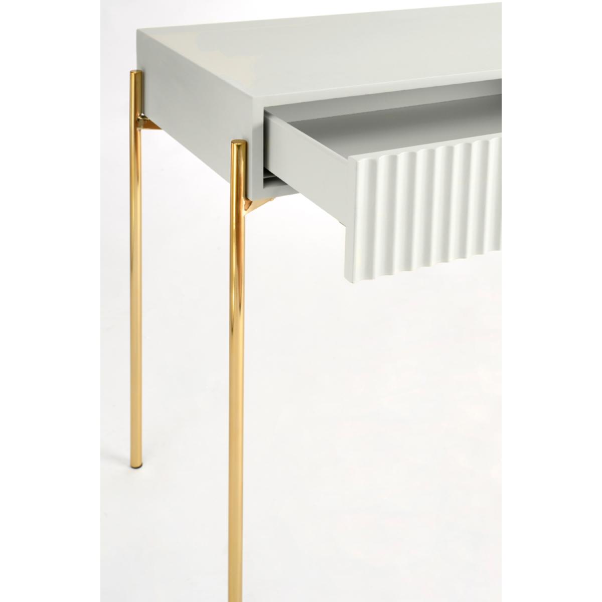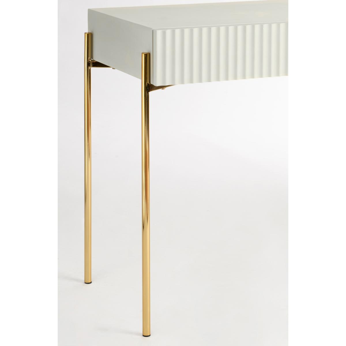 A chic, contemporary console table with reeded detailing to drawer fronts. Push catch drawer closures – push in the centre of the drawers to open or close. Durable polyurethane paint finish in a soft pebble grey colour. Brushed stainless steel legs with brass finish. Simple assembly required.