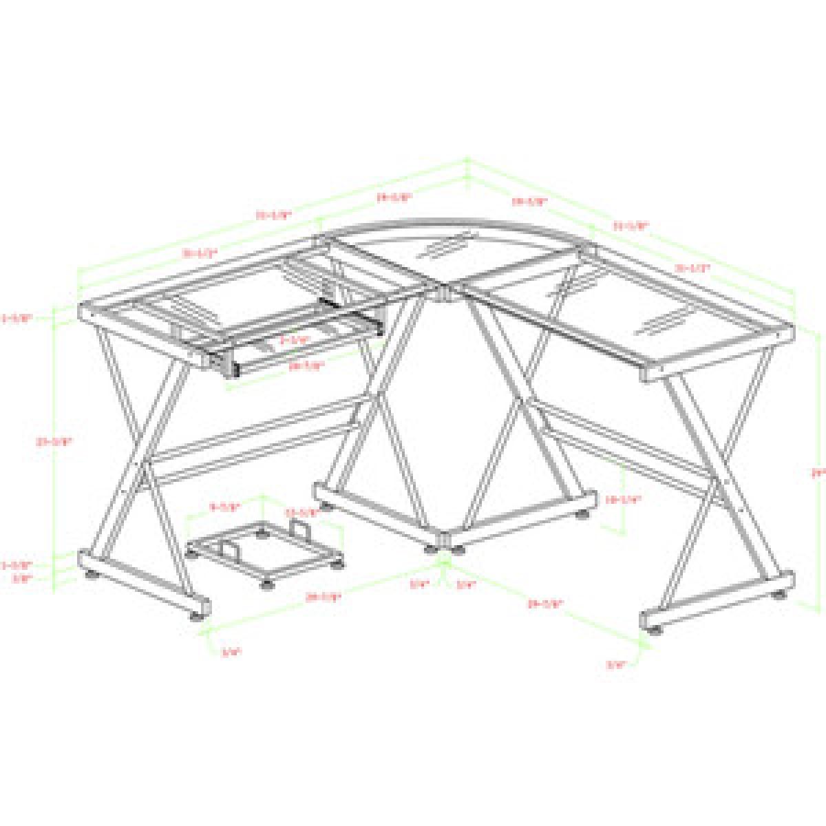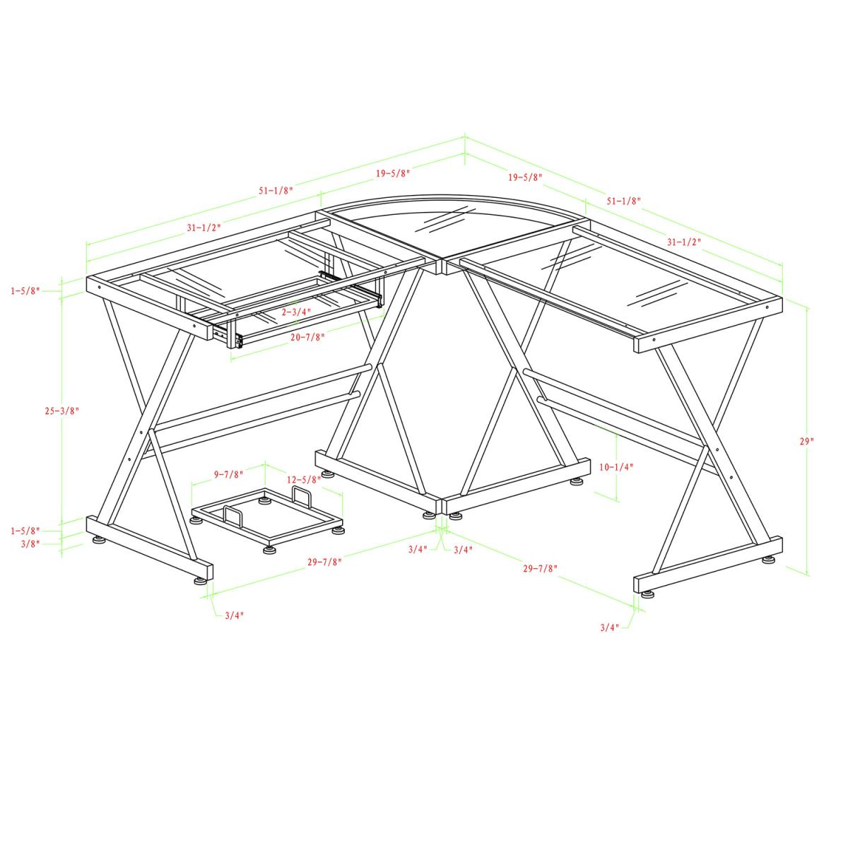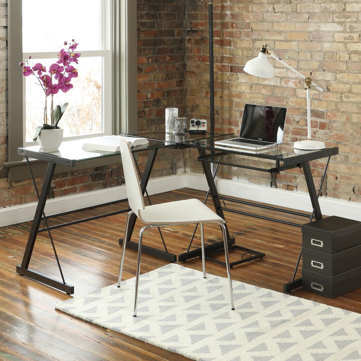 Modernize your home office or study with this Lexon Corner Desk, crafted from durable steel with a powder coat finish and thick, tempered safety glass. The L-shape design of this computer desk provides the perfect fit for space-saving needs and features a sliding keyboard tray and CPU stand. Its flexible configuration allows you to mount the tray on either side of the desk according to your needs.