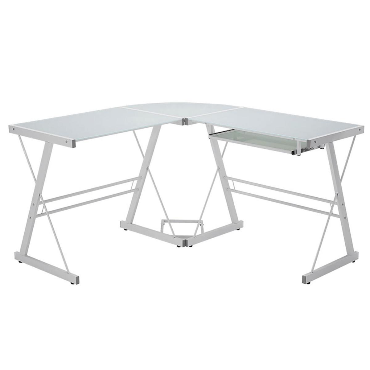 Modernize your home office or study with this Lexon Corner Desk, crafted from durable steel with a powder coat finish and thick, tempered safety glass. The L-shape design of this computer desk provides the perfect fit for space-saving needs and features a sliding keyboard tray and CPU stand. Its flexible configuration allows you to mount the tray on either side of the desk according to your needs.