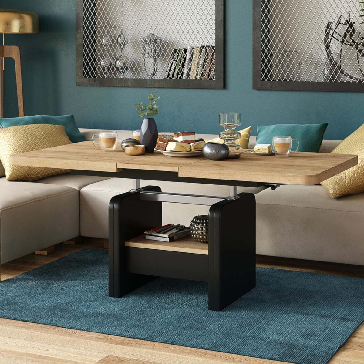 The substantial design and the use of rounded shapes are what distinguishes this coffee table from others. Thanks to two inserts and high-quality synchronous guides, it can easily be transformed into a fully functional table with a surface of 150 or 180 cm. The use of a pneumatic lift additionally allows for smooth height adjustment as needed. Well-made legs make the furniture 100 stable, even when fully extended and raised! Additional advantages include a shelf and a drawer, ensuring that all necessary items are always within reach.