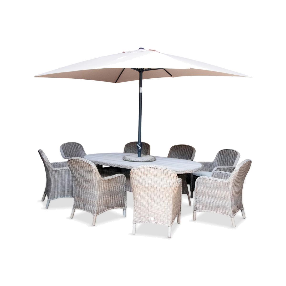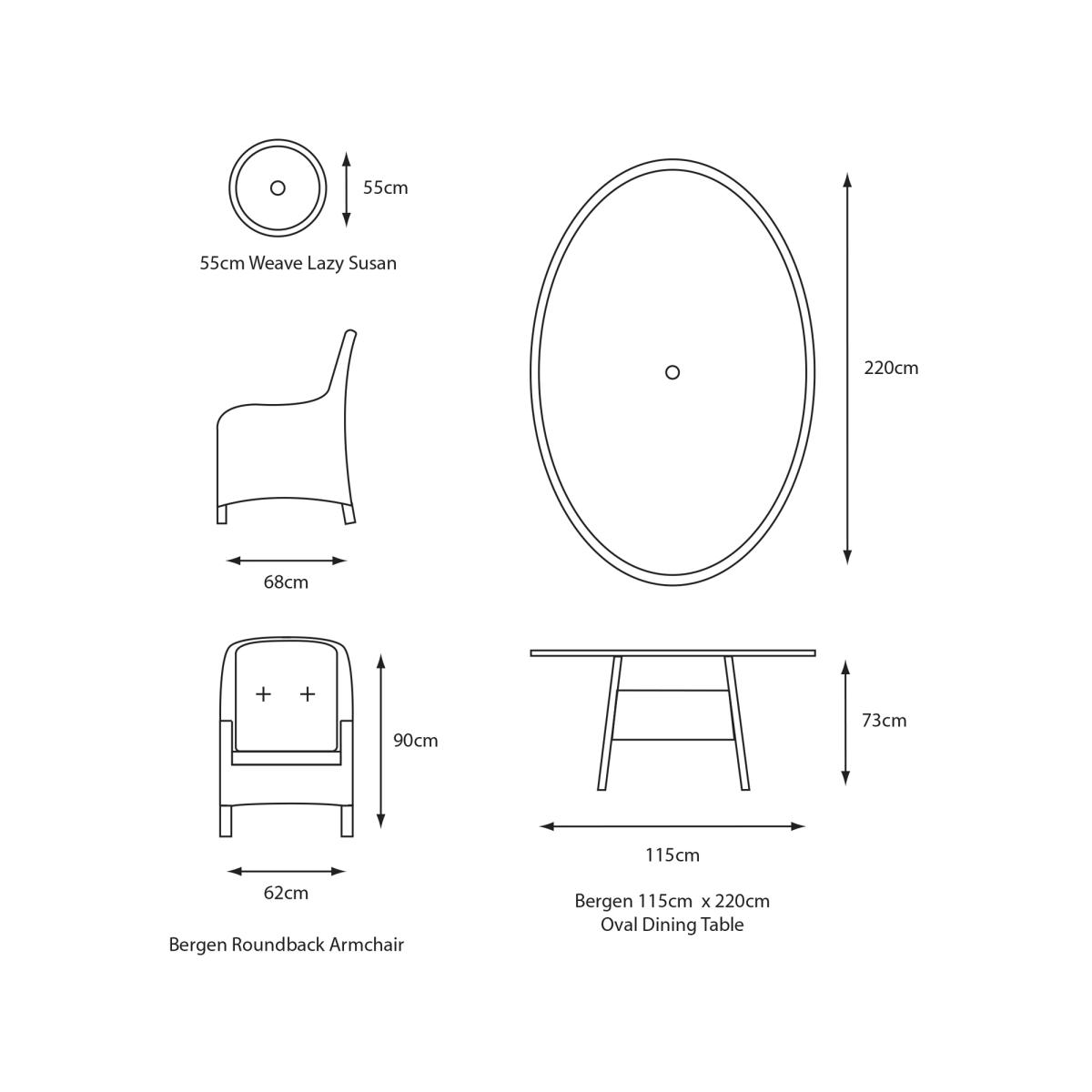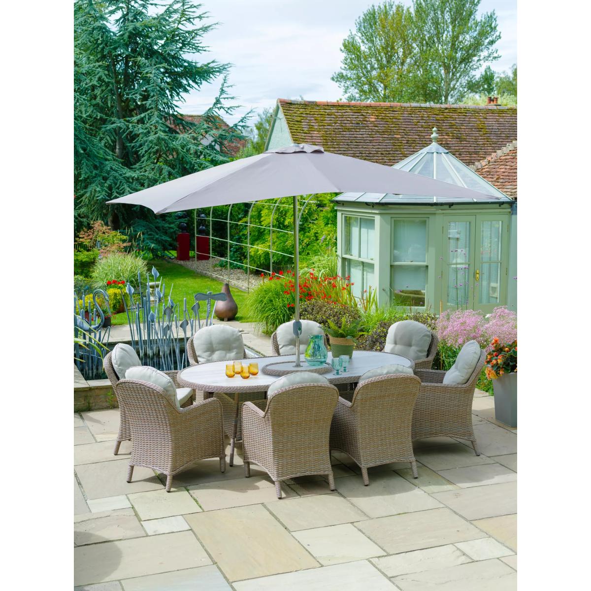 The Bergen range from LG Outdoor pairs robust aluminium frames with natural-looking, all-weather synthetic wicker. The furniture is lightweight, sturdy, weather-resistant and easy to maintain. The round back dining armchairs are designed for comfort and the oval dining table has a silvered oak-effect painted glass top. This set comes with an adjustable parasol pole and fabric shade for sun protection. Season-proof Eden cushions in the range enhance your comfort and are water-repellent during light rainfall, quick-drying and are UV-resistant to prevent colour fading. They have bull-nosed curved edges for comfort and removable covers for easy cleaning. Store the cushions during persistent and heavy rain and over winter months. Key features: Eight-seater oval garden dining table with Lazy Susan 5mm thick oak-effect safety glass tabletop Eight Ever. Weave synthetic wicker garden dining armchairs Sturdy aluminium frames Season-proof Eden seat cushions for comfort< Table has a parasol hole and comes with an adjustable parasol