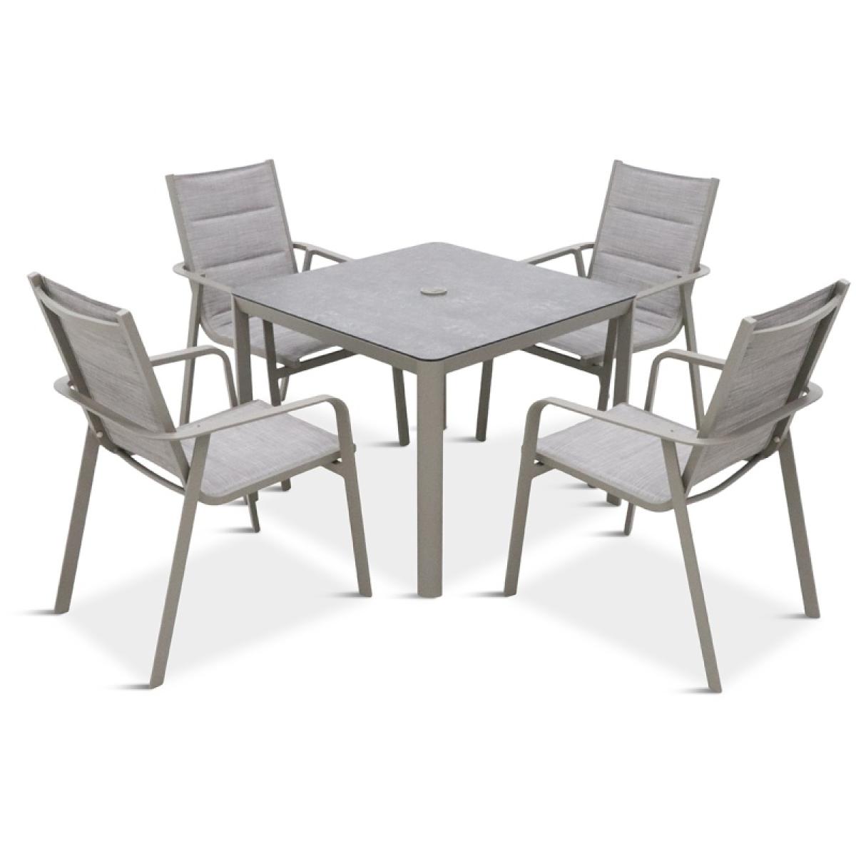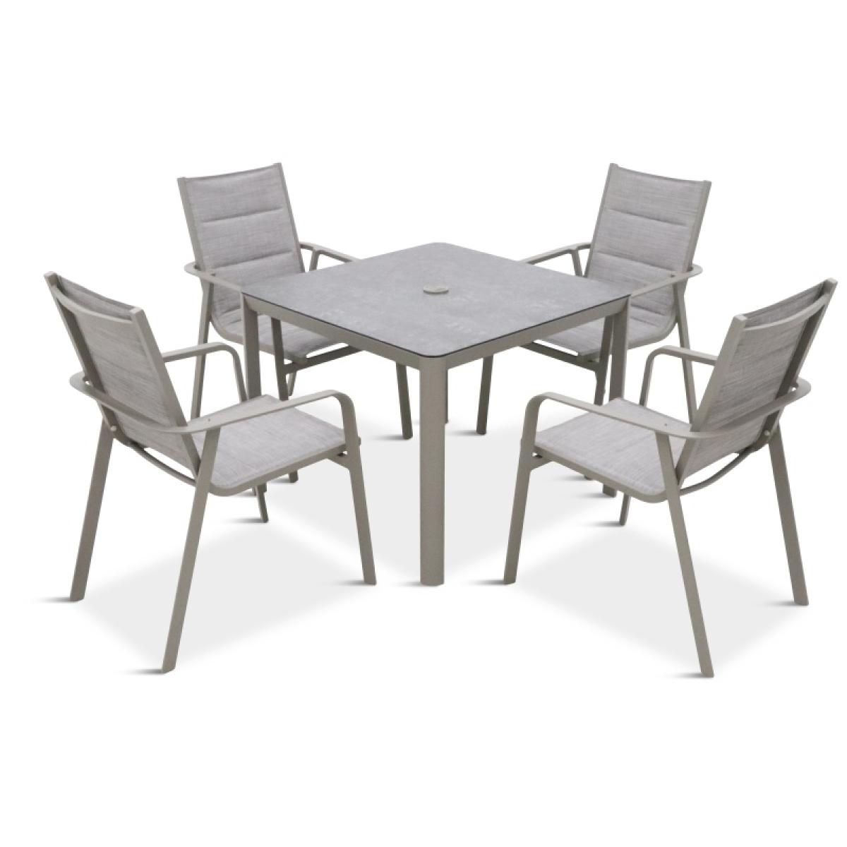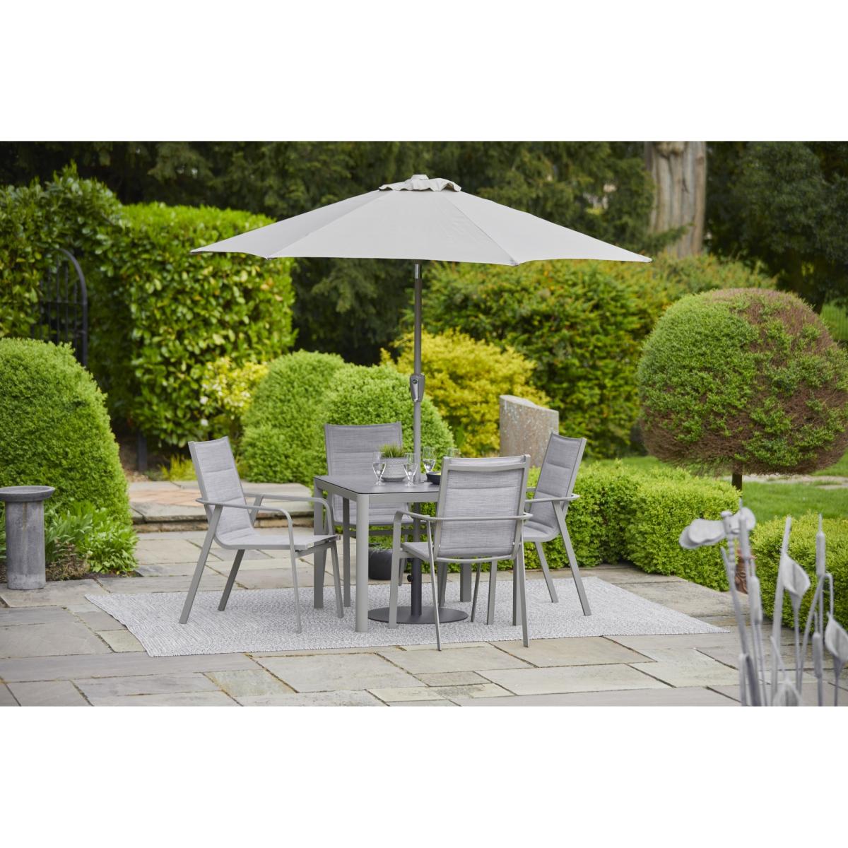 Introducing the Capri 4 Seat Dining Set from LG Outdoor, where sophistication meets quality craftsmanship. With its understated platinum-coloured premium powder coating, angular yet gracefully curved frame, and the addition of high-quality supportive season-proof Eden cushions – water repellent, quick drying, and UV resistant – you can be confident you've chosen the best quality for your outdoor space. The sleek tabletops are tastefully adorned with stone-effect, ceramic-coated toughened safety glass, ensuring both a pleasing aesthetic and long-lasting durability. Make a statement with your outdoor experience with the Capri Range, where every detail reflects a commitment to excellence and style. KEY FEATURES: Low Maintenance, Powder-Coated Aluminum Frames:Ensures durability and style. 'Eden' Season-Proof Cushions: Water repellent, quick-drying, and UV resistant for all-weather use. 'StainSAFE' Technology: Forms an invisible barrier against spills, ensuring effortless cleaning and maintenance. 'Eco Core' Elements: Incorporates eco-friendly materials, promoting sustainability and comfort in design. 4 x Stackable Padded Texteline Chairs Ceramic Glass Stone-Effect Table Top Floating Table Top 2.5m Crank & Tilt Parasol included Assembly Required DIMENSIONS: Chairs: H 94cm x W 68cm x D 57cm Table: H 54cm x W 90cm x D 90cm Parasol Diameter: 2.5m Please note, all screens vary in colour reproduction and whilst every effort has been made to display the colour as accurately as possible it is for guidance only.