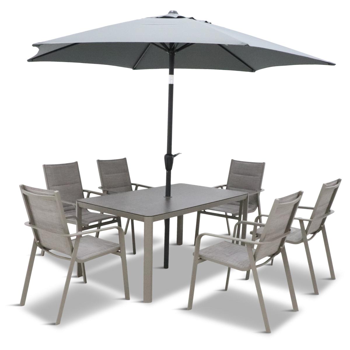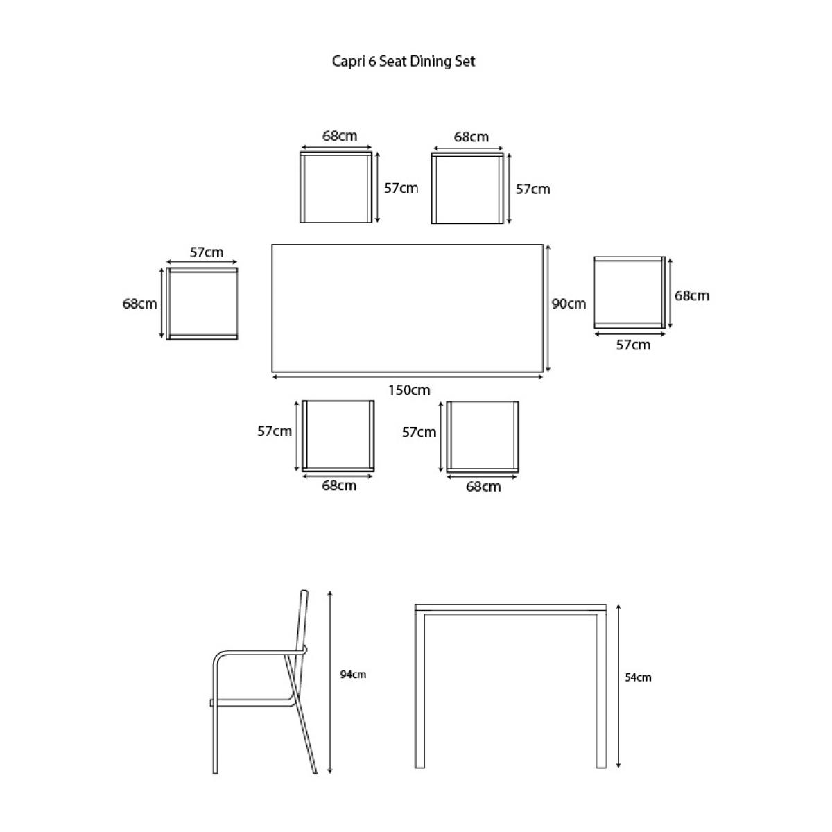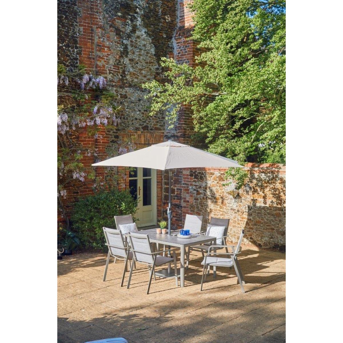 Please note, scatter cushions and accessories pictured are for demonstration purposes only and are not included. Introducing the Capri 6 Seat Dining Set from LG Outdoor, where sophistication meets quality craftsmanship. With its understated platinum-coloured premium powder coating, angular yet gracefully curved frame, you can be confident you've chosen the best quality for your outdoor space. The sleek tabletops are tastefully adorned with stone-effect, ceramic-coated toughened safety glass, ensuring both a pleasing aesthetic and long-lasting durability. Make a statement with your outdoor experience with the Capri Range, where every detail reflects a commitment to excellence and style. KEY FEATURES: Low Maintenance, Powder-Coated Aluminum Frames:Ensures durability and style. 'StainSAFE' Technology: Forms an invisible barrier against spills, ensuring effortless cleaning and maintenance. 'Eco Core' Elements: Incorporates eco-friendly materials, promoting sustainability and comfort in design. 6 x Stackable Padded Texteline Chairs Ceramic Glass Stone-Effect Table Top Floating Table Top 3.0m Crank & Tilt Parasol included Assembly Required DIMENSIONS: Chair: H 94cm x W 68cm x D 57cm Table:H 54cm x W 150cm x D 90cm Please note, all screens vary in colour reproduction and whilst every effort has been made to display the colour as accurately as possible it is for guidance only.